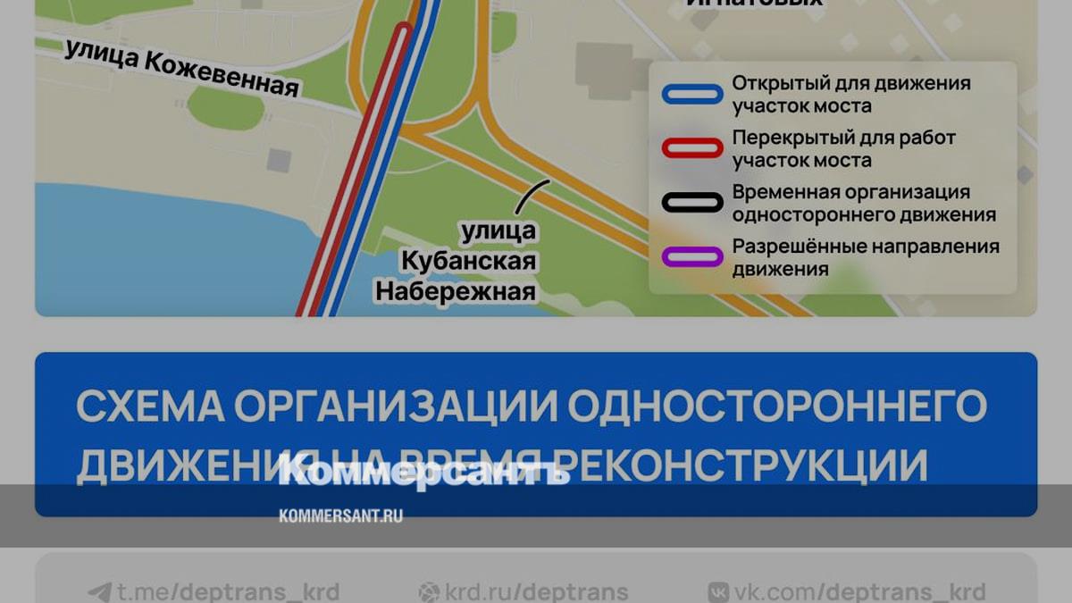 В частности, односторонним станет спуск с моста, участок улицы Буденного от Тургенева до Братьев Игнатовых, а также отрезок улицы Братьев Игнатовых до улицы Калинина. Кроме того, при движении по Буденного в направлении моста на пересечении с улицей Братьев Игнатовых поворот будет возможен только налево или направо. При движении по Кубанской набережной в сторону Калинина будет запрещен прямой проезд: водители смогут повернуть только под мост или на улицу Буденного.