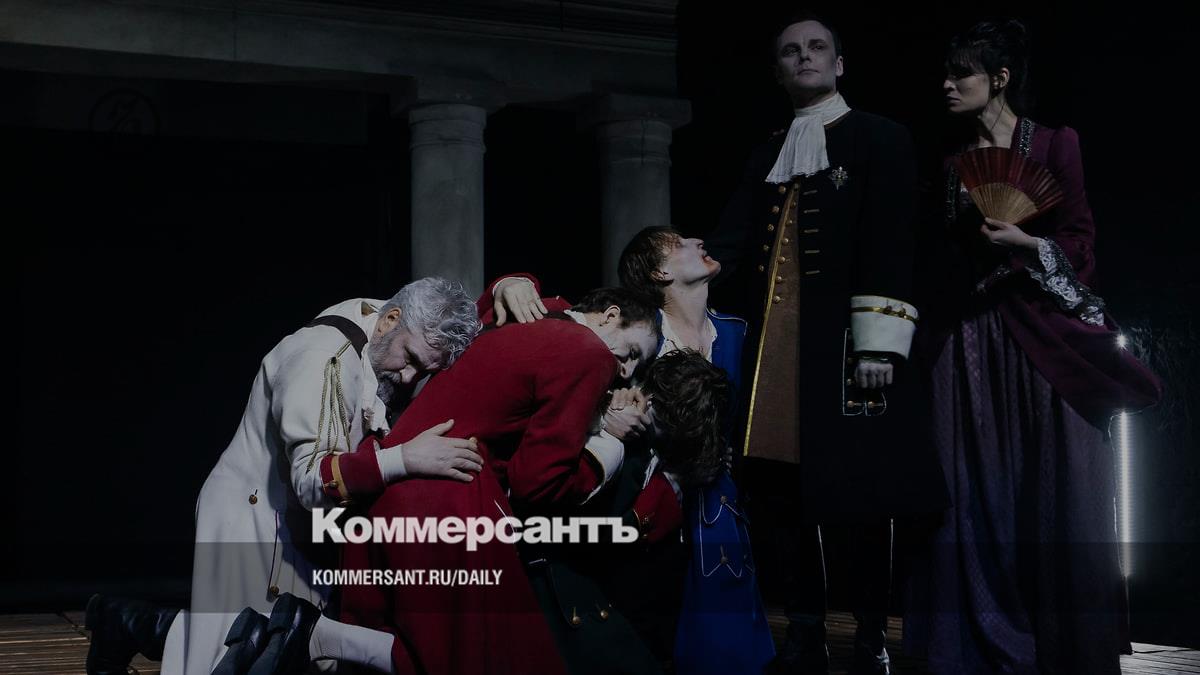 Художник Алексей Лобанов выстроил на сцене театральный портик с колоннами, за которым прокручиваются рулонные декорации, обозначая места действия. Актеры поначалу поют, принимая картинные позы (за музыку в спектакле отвечает композитор Ольга Шайдуллина), и двигаются как марионетки, о грации которых Клейст, кстати, написал целое эссе. Но больше они напоминают детей, играющих в разноцветных деревянных солдатиков, которые стоят по краям помоста. Они старательно, как в школе, записывают на планшетах указания курфюрста о боевой диспозиции, а мечтательный принц Гомбургский (его замечательно играет актер Камерного театра Михаил Гостев) в это время переглядывается со своей возлюбленной Наталией Оранской (Татьяна Солошенко) и не слушает старших. В общем, актеры увлеченно дурачатся и ломают комедию. «Как война?» — спрашивает Наталья после потешного боя. «Победил!» — радостно отвечает принц и встает на голову.