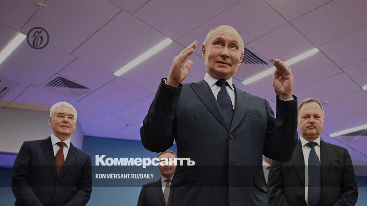 Президент России Владимир Путин (в центре), мэр Москвы Сергей Собянин (слева), ректор МГТУ им. Н.Э. Баумана Михаил Гордин (справа) и министр науки и высшего образования России Валерий Фальков (второй слева)