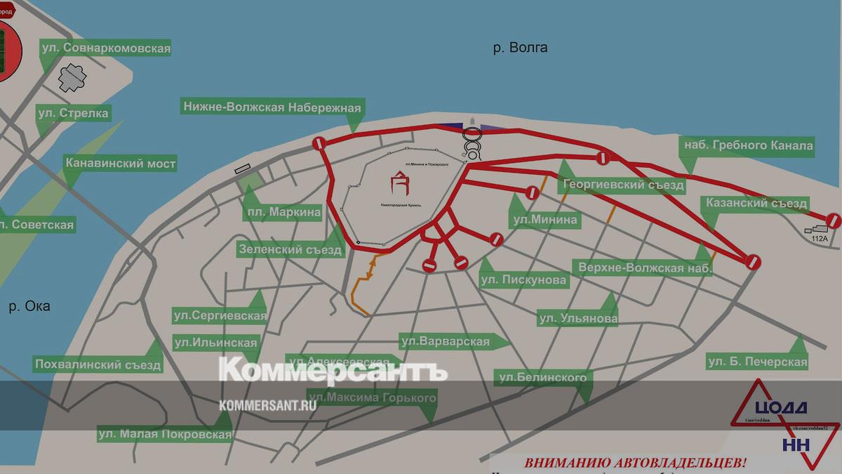 Частично будут перекрыты площадь Минина и Пожарского (от памятника Чкалову до улицы Большой Покровской), улицы Ульянова, Варварская, Минина, Алексеевская (от площади Минина до улицы Пискунова), Широкая (от Нижневолжской набережной до Зеленского съезда), Зеленский съезд (от площади Минина до улицы Широкой). И набережные Верхневолжская (от площади Минина до площади Сенной), Нижневолжская (от Благовещенской площади до Казанского съезда), Гребного канала (от Казанского съезда до улицы Слобода Печеры, 112А). Также полностью перекроют Георгиевский съезд.