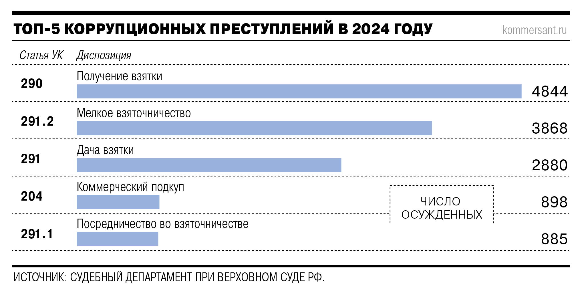 Самым распространенным преступлением остается получение взятки. За это осуждено 4844 человека.
