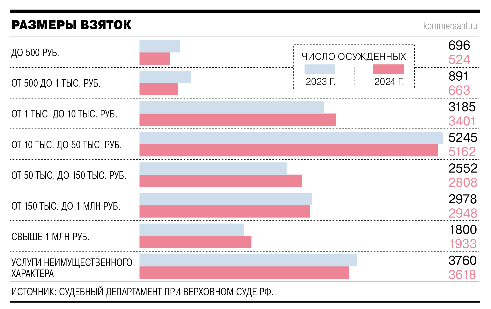 Общее количество коррупционеров по сравнению с 2023 годом, когда их насчитали 22 014, немного сократилось, зато взяточников-миллионеров стало больше на 133 человека. Общая же картина осталась практически такой же, как и годом ранее. Хотя, например, в 2022 году взятки в виде «услуг неимущественного характера» были только на третьем месте, уступая как взяткам в пределах 10–50 тыс. руб., так и совсем скромным подношениям в 1–10 тыс. руб.