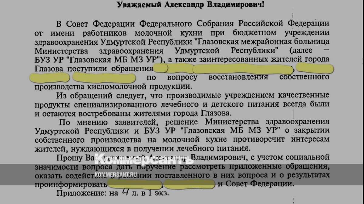 В письме к главе Удмуртии госпожа Писарева со ссылкой на обращение глазовчан пишет, что «производимые учреждением качественные продукты специализированного лечебного и детского питания всегда были и остаются востребованы жителями города Глазов». Среди прочего господина Бречалова попросили «оказать содействие в решении вопроса» и проинформировать СФ.