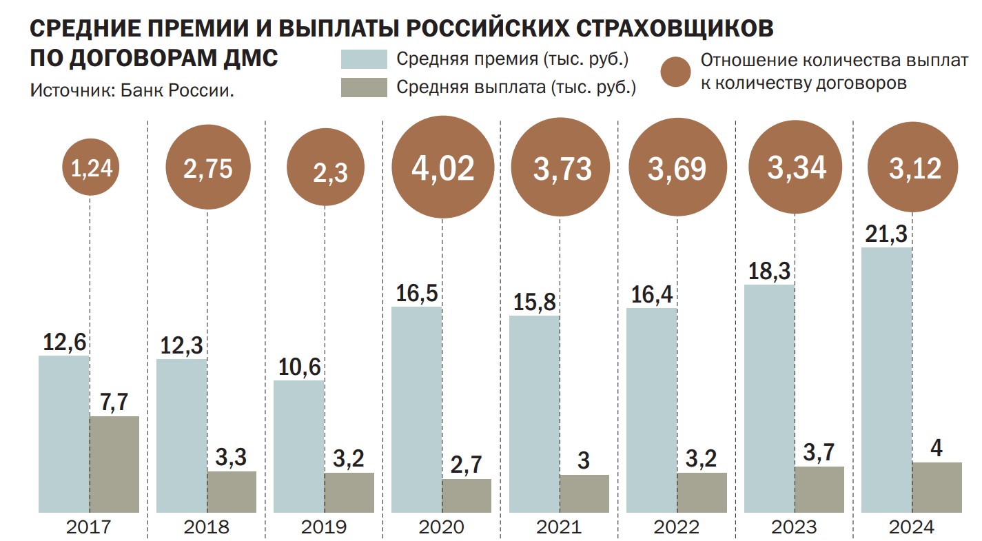 Банк России в своих аналитических материалах отмечает, что в 2024 году работодатели стремились ограничить свои издержки на добровольное медицинское страхование (ДМС) за счет заключения договоров с меньшим набором рисков. Об этом свидетельствует снижение среднего размера страховой суммы на одного застрахованного почти в два раза по сравнению с 2023 годом — до 6,6 млн руб. «В условиях высокой инфляции в 2024 году работодатели оформляли договоры с меньшим набором включенных рисков, чем в предыдущем году. Это позволило им ограничить рост издержек на ДМС без снижения числа застрахованных сотрудников»,— отмечает регулятор.