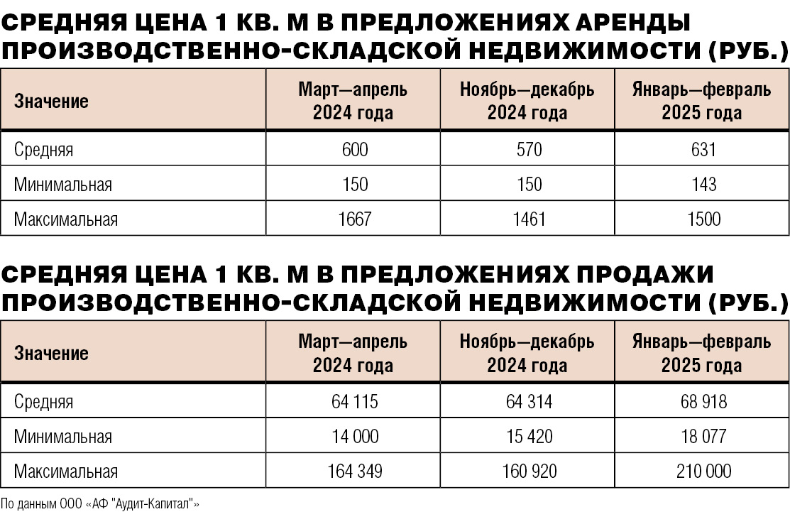 По данным ООО «АФ "Аудит-Консалтинг"», в Краснодаре за последние 10 лет средняя цена «квадрата» в предложениях продажи производственно-складской недвижимости выросла более чем в два раза — с 27,2 тыс. в 2014 году до 63,9 тыс. руб. в 2024-м. За январь—февраль 2025 года средняя цена предложения продажи производственно-складской недвижимости составила почти 68 тыс. руб. за кв. м.
