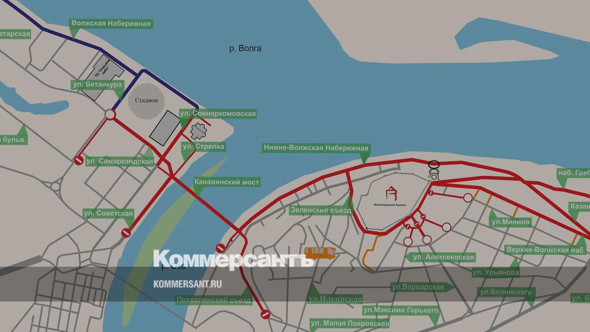 С 22:00 24 мая до 15:00 25 мая полностью или частично перекроют Волжскую набережную, улицы Бетанкура, Совнаркомовскую, Самаркандскую, Советскую, Керченскую, Канавинский мост, Похвалинский съезд, Нижне-Волжскую набережную, улицы Красная Слобода и Широкую, Зеленский, Георгиевский и Казанский съезды, набережную Гребного канала, Верхне-Волжскую набережную, улицу и площадь Минина, улицы Ульянова, Варварскую и Алексеевскую.
