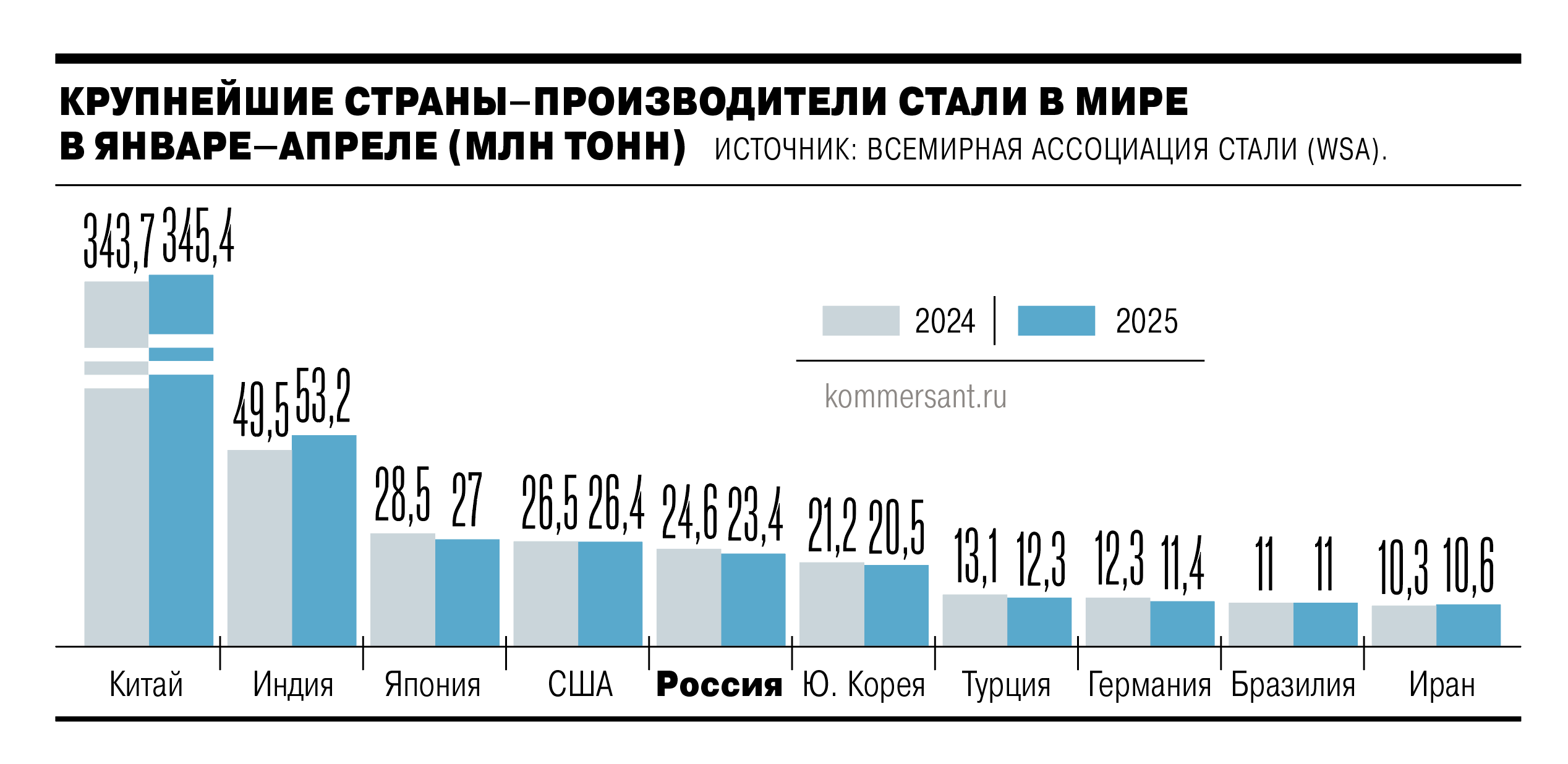 По данным WSA, в апреле в Китае было произведено 86 млн тонн стали, что соответствует уровню апреля 2024 года. За четыре месяца производство стали выросло на 0,4% год к году, до 345,4 млн тонн. По словам собеседника “Ъ” в металлургической компании, из-за «лавины китайского экспорта», которая доходит уже до стран Средней Азии, цены на внешних рынках сейчас находятся на минимуме за пять лет. А российской стали на мировом рынке конкурентоспособности не добавляет укрепление рубля, указывает источник “Ъ”. По словам Ахмеда Алиева, если сообщения о планах Китая сократить выплавку стали в этом году на 50 млн тонн правдивы, то за май—декабрь производство в стране должно упасть на 7% год к году, а это представляется «слишком агрессивным».