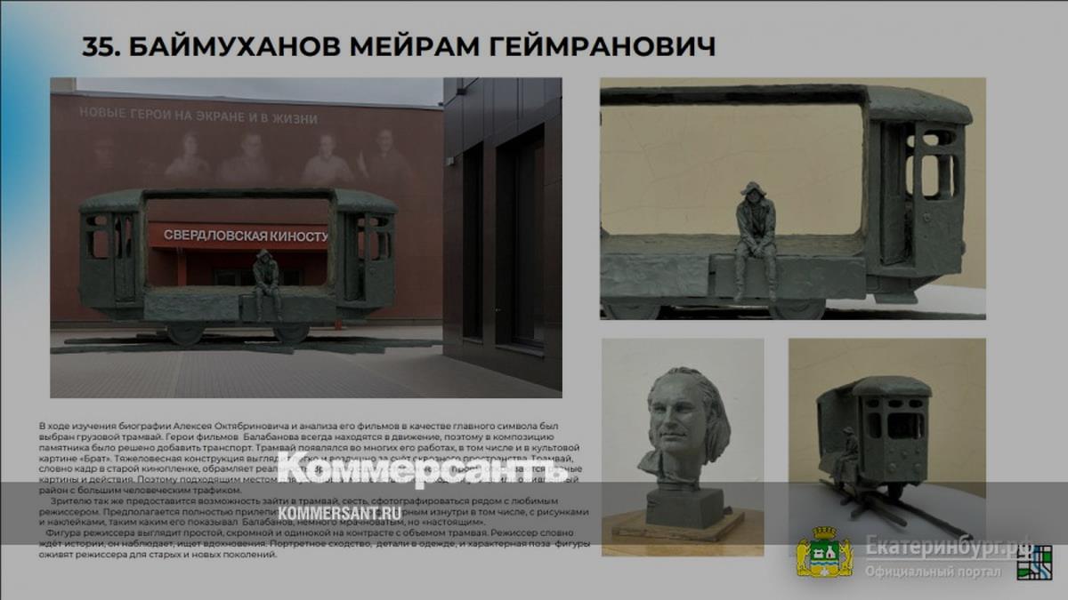 На эскизе победителя кинорежиссер сидит в пустом вагоне трамвая. «Имя Алексея Балабанова навсегда вписано в историю российского кино. У его фильмов есть истинно уральский дух»,— отметил мэр Екатеринбурга Алексей Орлов.