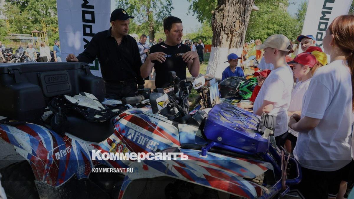 Полпред в УрФО Артем Жога (слева) и гонщик Артем Карякин (второй слева) показывают детям квадроциклы