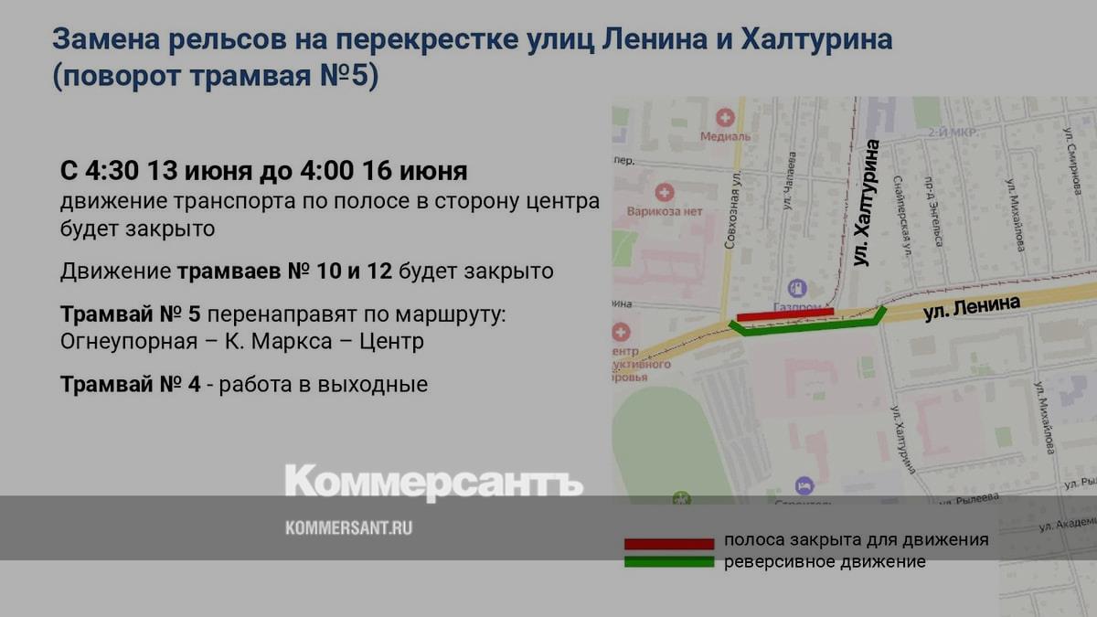 Движение трамваев №10 и №12 закрыто до утра понедельника из-за замены трамвайных путей на перекрестке улиц Ленина и Халтурина. Трамвай №5 перенаправлен по маршруту Огнеупорная — Карла Маркса — Центр. Дополнительно в выходные дни выйдет на обычный маршрут трамвай №4. Об этом сообщили в администрации города.