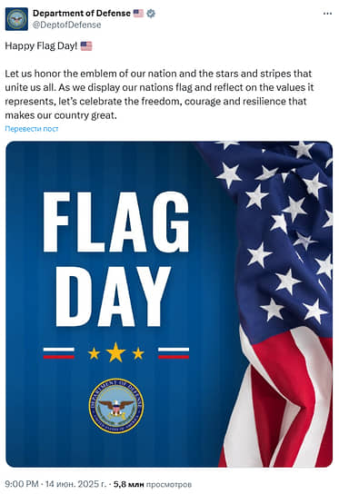 «Давайте почтим звезды и полосы, которые объединяют нас всех»,— говорится в сообщении Пентагона. При этом основной американский флаг расположен справа от текста.