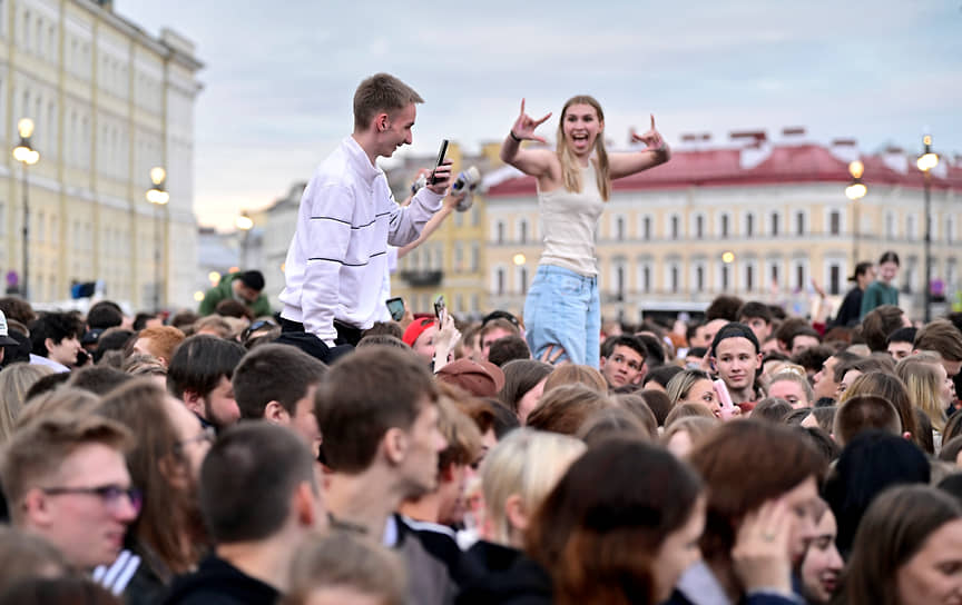 На Дворцовую площадь 28 июня на общегородской праздник выпускников «Алые паруса» пришли около 100 тыс. человек. Среди них были не только бывшие школьники, сообщили в Смольном.