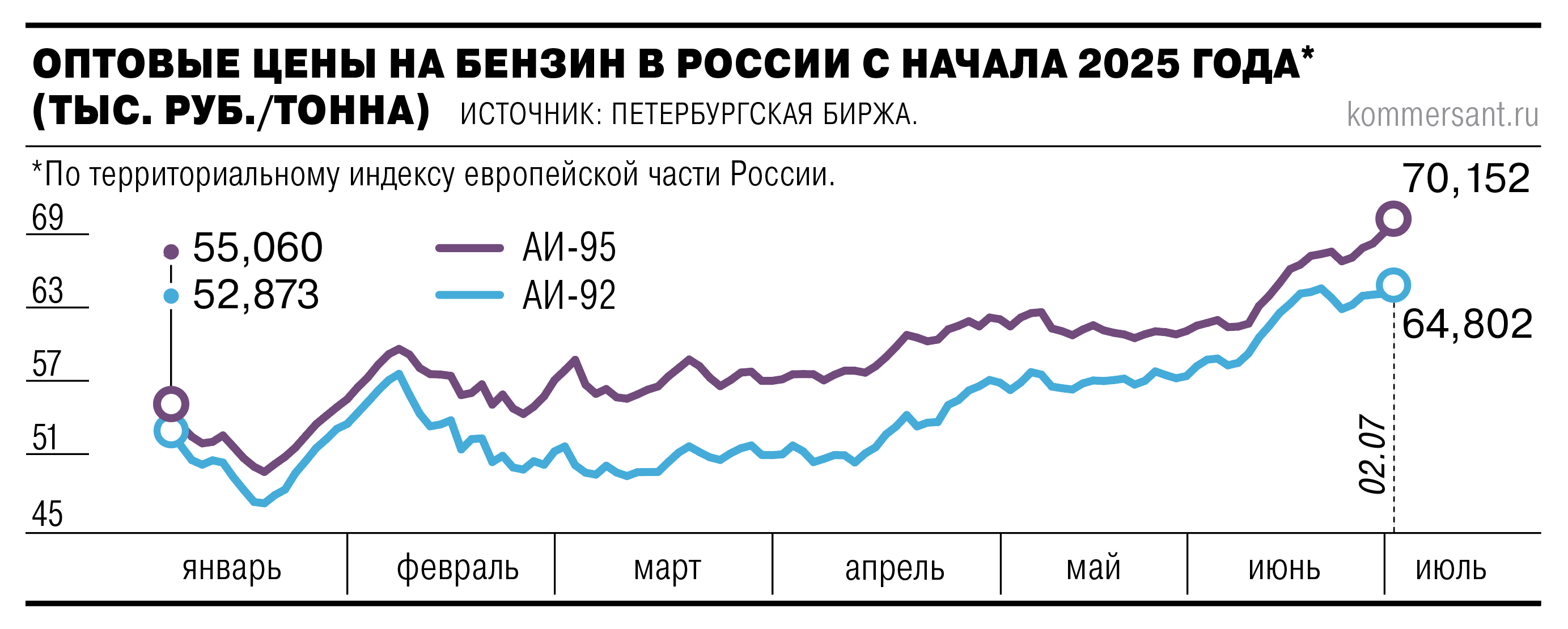 Котировки марки АИ-95 на Петербургской бирже 2 июля выросли на 1,7%, до 70,15 тыс. руб. за тонну, обновив максимум со 2 сентября 2024 года, когда цены превышали 73,5 тыс. руб. за тонну. В начале июля прошлого года АИ-95 на бирже стоил около 70 тыс. руб. за тонну. Оптовая стоимость АИ-92 находится на пике за последний год — 64,8 тыс. руб. за тонну.