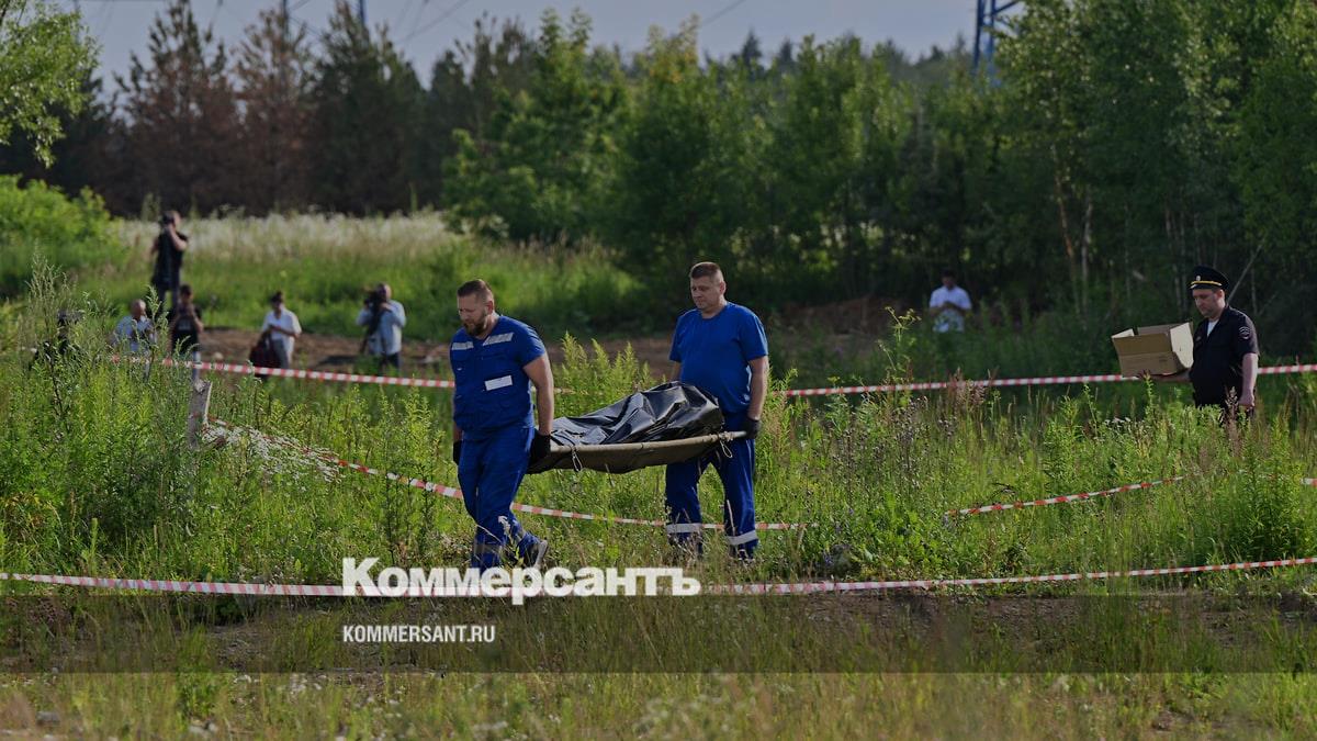 Сотрудники экстренных служб выносят тело бывшего министра транспорта Романа Старовойта с места происшествия в поселке Раздоры