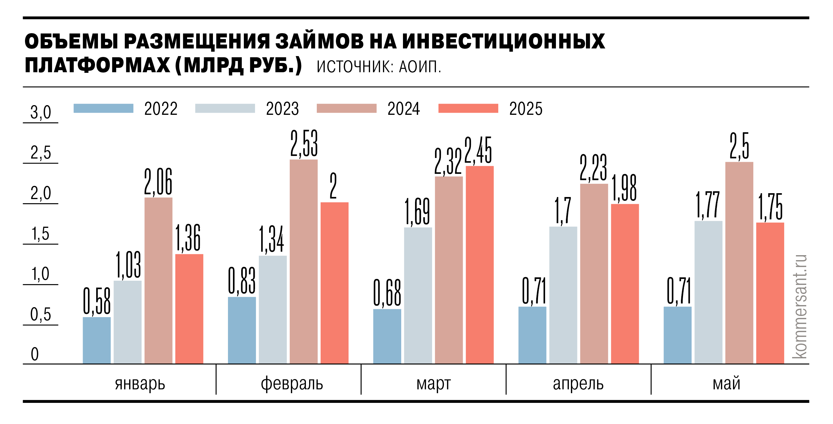 По итогам мая 2025 года объем размещения займов на краудфандинговых платформах составил всего 1,75 млрд руб., почти на 20% меньше, чем в апреле. Такие данные опубликовала в своем Telegram-канале Ассоциация операторов инвестиционных платформ (АОИП). Падение выдач происходит второй месяц подряд, после стремительного роста в феврале и марте. По сравнению с результатом прошлого года объем выдачи сократился на 30% и фактически вернулся к значению двухлетней давности — мая 2023 года (1,76 млрд руб.). Вместе с тем, по оценке АОИП, за пять месяцев 2025 года объем выданных займов составил 9,5 млрд руб., что лишь на 18% ниже аналогичного показателя предыдущего года.