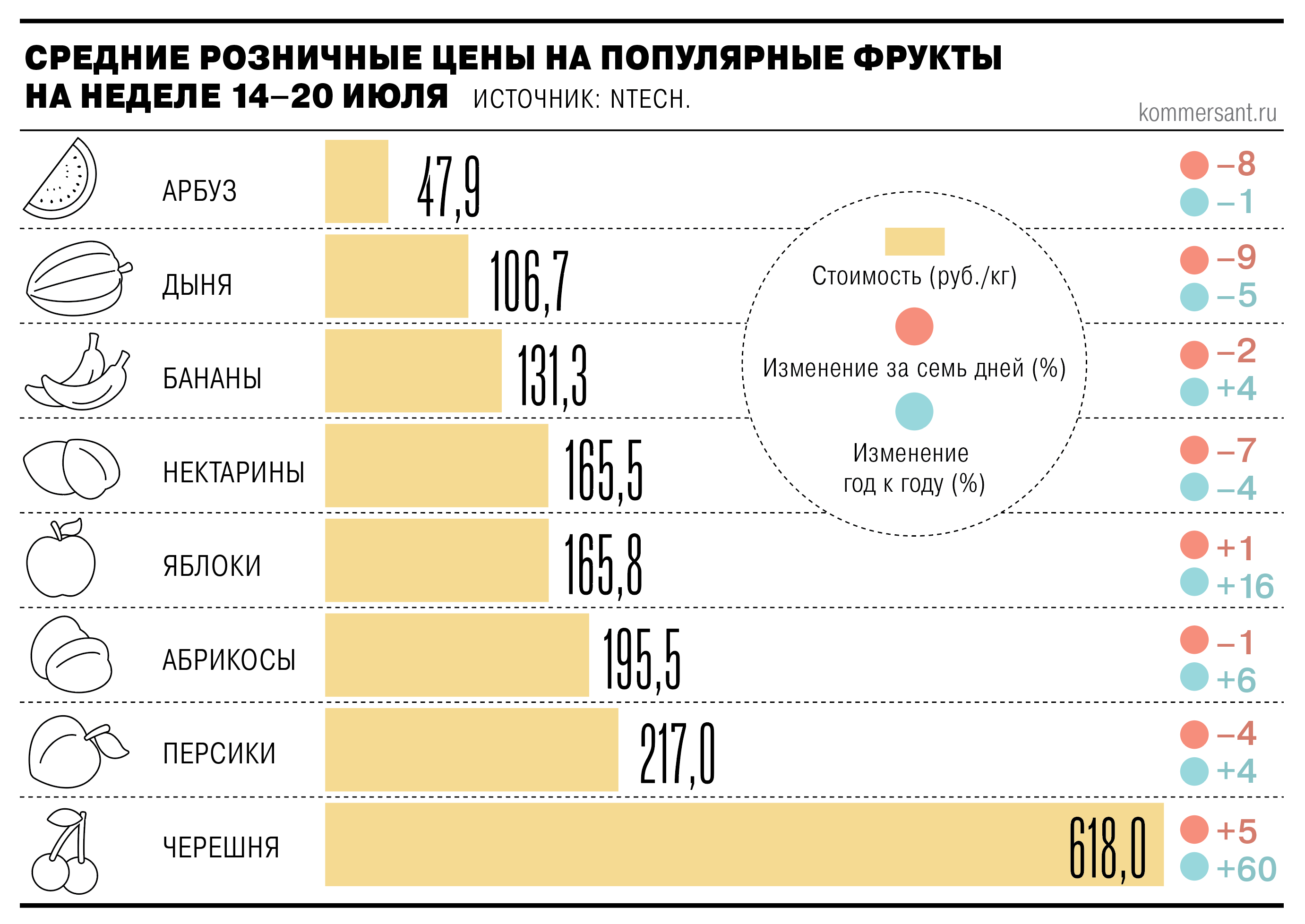 Согласно подсчетам исследовательской компании NTech, на неделе 14–20 июля средняя розничная стоимость арбуза составила 47,9 руб. за 1 кг. Год к году это значение сократилось на 1%, за неделю — на 8%. Для дынь аналогичное снижение составило 5% и 9% соответственно, до 106,7 руб. за 1 кг. В Metro отмечают, что закупочные цены на арбузы и дыни сейчас примерно на уровне прошлого года, но продаются на 3–5% дешевле.