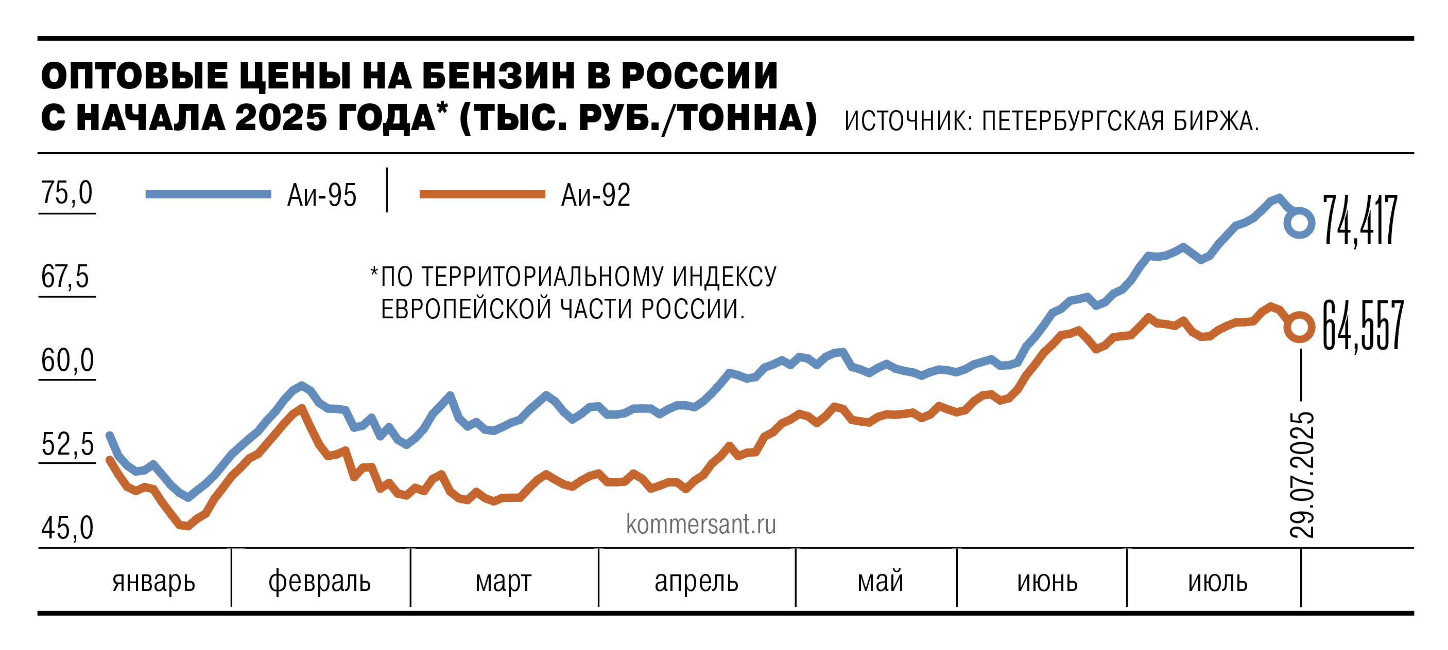 Цены на бензин АИ-92 на Петербургской бирже по территориальному индексу европейской части России 29 июля снизились на 1,57%, до 64,55 тыс. руб. за тонну. Котировки вернулись на уровень середины июля. АИ-95 на бирже подешевел на 0,72%, до 74,41 тыс. руб. за тонну, вернувшись примерно к уровню 21 июля. Стоимость дизельного топлива снизилась на 0,2%, до 57,82 тыс. руб. за тонну.