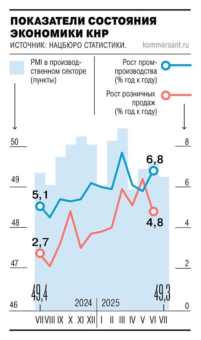 Настроения бизнеса в Китае продолжают ухудшаться, следует из поступающих данных. Индекс деловой активности (PMI) в производственном секторе, как сообщили вчера в Государственном статистическом управлении (ГСУ) страны, в июле снизился до 49,3 пункта с 49,7 в июне. Аналитики, опрошенные агрегатором экономической статистики Trading Economics, ожидали, что в июле индекс не изменится. Ниже отметки 50 пунктов, отделяющей рост от спада, показатель между тем остается четвертый месяц подряд.