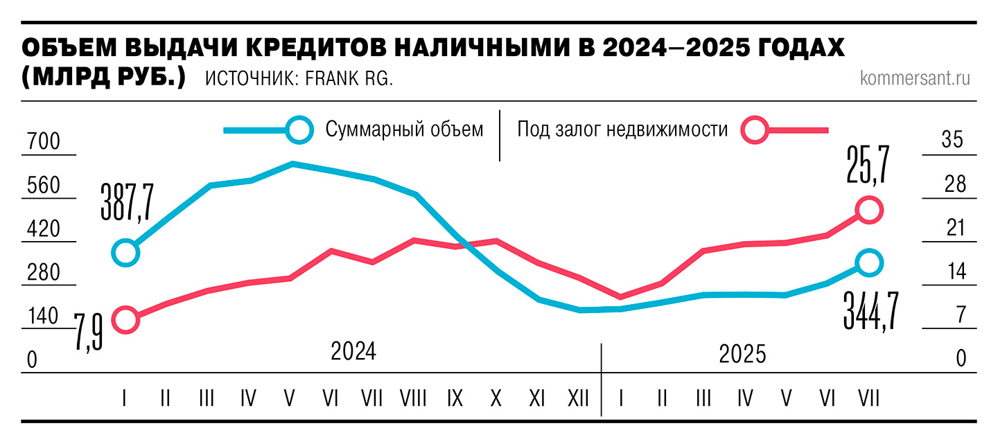 По данным Frank RG, в июле он достиг 25,7 млрд руб., максимума с начала 2023 года. В Сбербанке также фиксируют рост спроса на такие кредиты — в июле выдачи выросли на 23%, до 5,6 млрд руб. «Частично кредиты с залогом представляют собой переток из необеспеченного сегмента»,— поясняет Иван Уклеин. По его словам, это связано с маневрированием между макропруденциальными лимитами, меньшим риском обеспеченного продукта для банка, давлением на капитал, более низкой ставкой для заемщика, большей суммой и вероятностью одобрения. По данным «Финуслуг», по кредитам наличными с обеспечением залогом ПСК составляет 27,9% годовых.