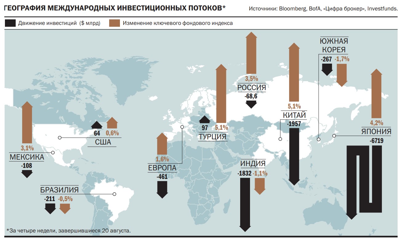 Даже с учетом последних инвестиций доля облигаций в портфелях мировых инвесторов остается на локальных минимумах. По данным BofA, вложения частных клиентов, активы которых оцениваются в $4,1 трлн, на 64,2% состоят из акций (максимальный уровень с марта 2022 года), на 18,1% — облигаций (минимальный уровень с мая 2022 года), на 10,6% — наличных (минимальный уровень с октября 2021 года). Такой перекос может вызывать беспокойство у инвесторов, тем более что наступила осень, не самый лучший период для акций. «Сентябрь—октябрь обычно самые волатильные месяцы для рынков, и в преддверии коррекции инвесторы любят перестраховаться и посидеть в защите»,— говорит портфельный управляющий Astero Falcon Алена Николаева. По факту в августе все мировые фонды акций привлекли лишь $7,3 млрд, что в четыре раза ниже инвестиций июля.