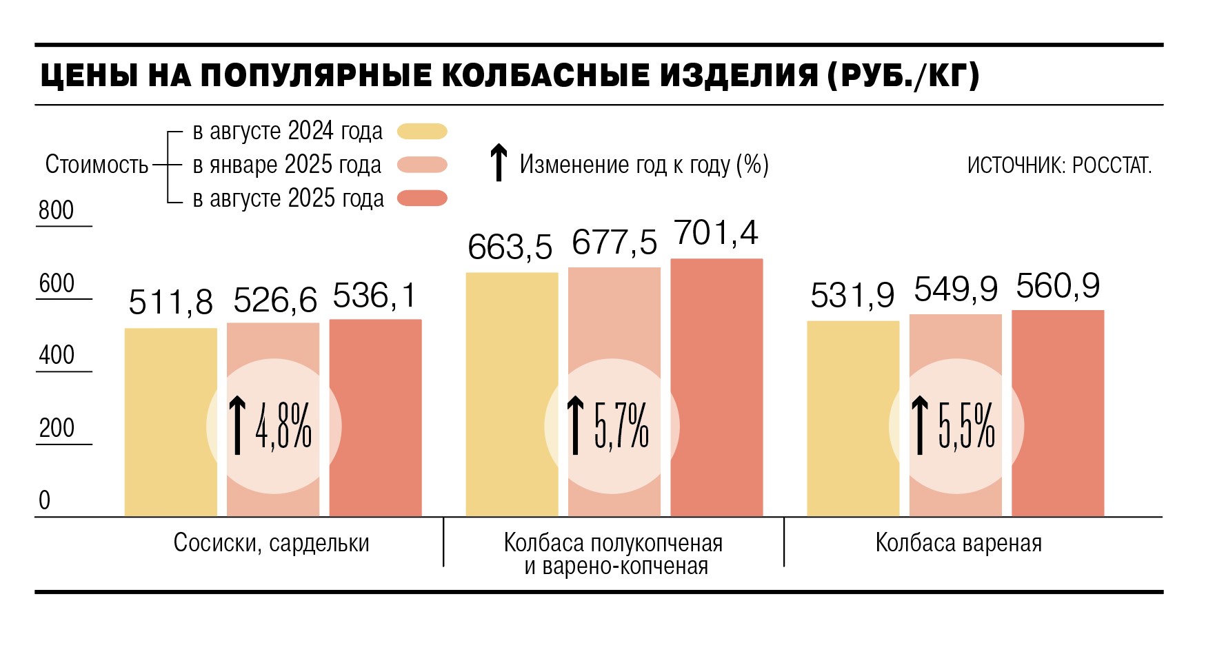 По данным NTech, продажи мясной гастрономии в период с июля 2024 года по июнь 2025 года выросли в денежном выражении на 10,3% год к году, в натуральном — только на 0,2%. По подсчетам «Нильсен», в январе—мае 2025 года натуральные продажи колбасных изделий выросли всего на 2% год к году, сосисок за тот же период — снизились на 3%.