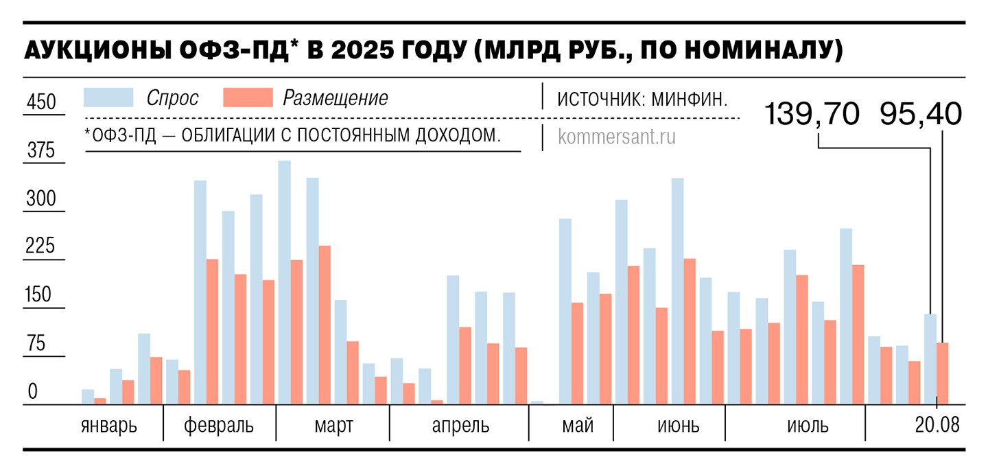 Состоявшиеся 20 августа аукционы по размещению ОФЗ прошли более результативно для Минфина, чем предыдущие в этом месяце. Как и на прошлой неделе, инвесторам было предложено два долгосрочных выпуска госбумаг — с постоянной доходностью (ОФЗ-ПД). Но если на прошлой неделе суммарный спрос с трудом перевалил за 90 млрд руб., то в этот раз он составил почти 140 млрд руб. Выросла и доля удовлетворенных заявок — с 62,4% до 68,3%. В итоге объем размещения составил 95,4 млрд руб.— лучший результат в этом месяце, но более чем вдвое уступающий показателю конца июля (см. “Ъ” от 31 июля).