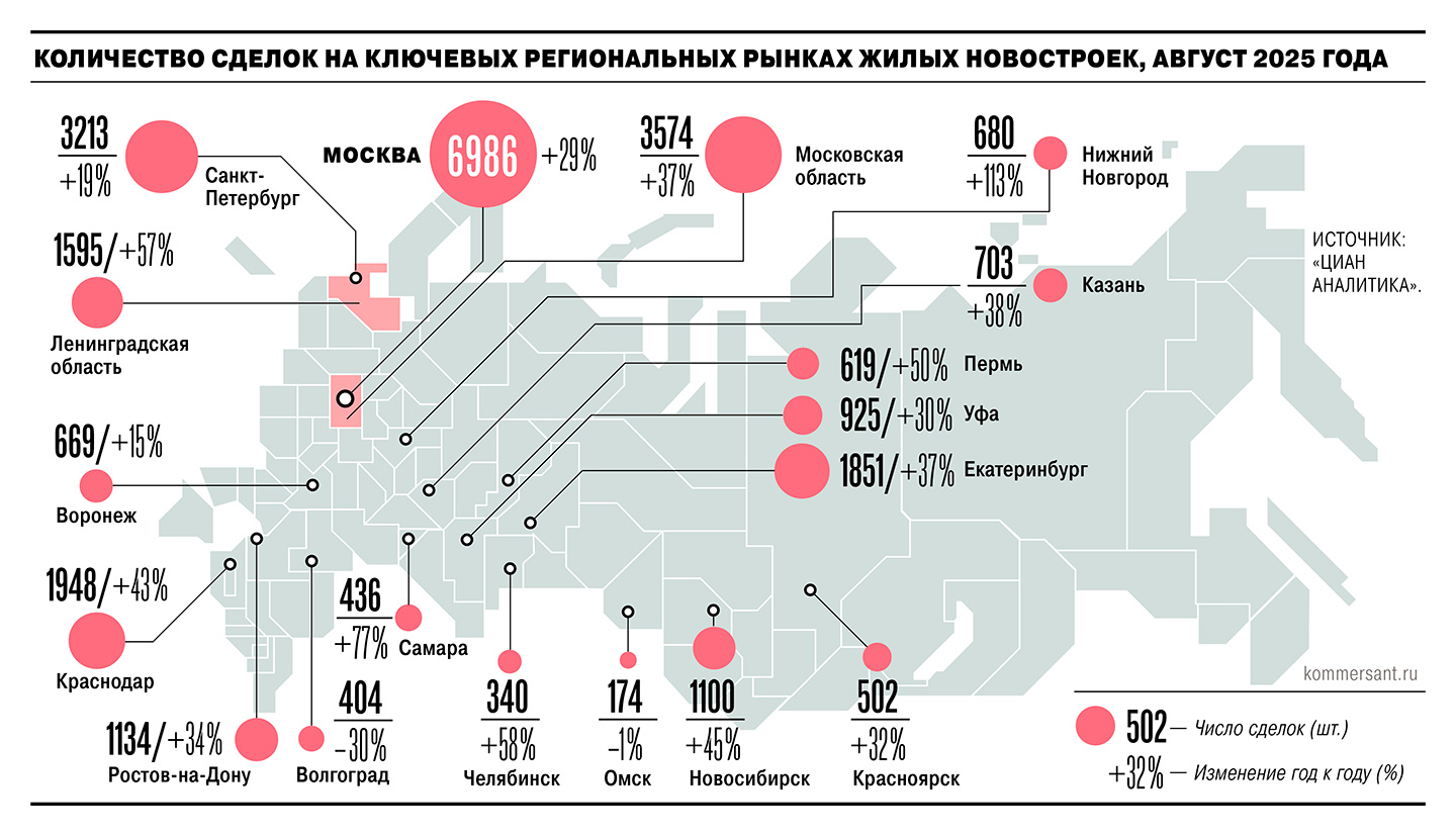 По итогам августа на рынке первичного жилья в российских городах-миллионниках заключено 29 тыс. договоров долевого участия (ДДУ), что на 34% больше год к году, подсчитали в сервисе «Яндекс Недвижимость» по запросу “Ъ”. Похожую динамику фиксируют в аналитическом сервисе Dataflat.ru, по данным которого в августе объем сделок в целом по РФ увеличился на 25% год к году, до 44 тыс. ДДУ.
