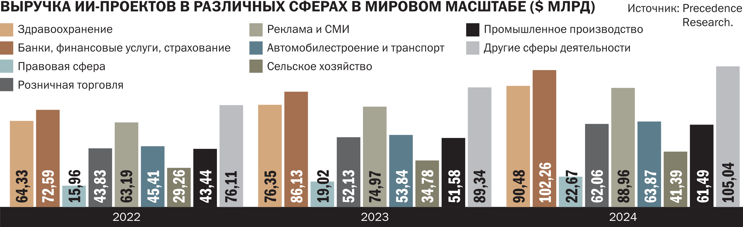 Согласно рыночному обзору, подготовленному Grand View Research, объем мирового рынка искусственного интеллекта в 2024 году оценивался в $279,22 млрд, а к 2030 году, по прогнозам, достигнет $1,812 трлн. В среднем с 2025 по 2030 год рынок будет расти ежегодно на 35,9%. Передовые ИИ-технологии будут активно внедряться в автомобилестроении, здравоохранении, розничной торговле, финансовой сфере и промышленном производстве.