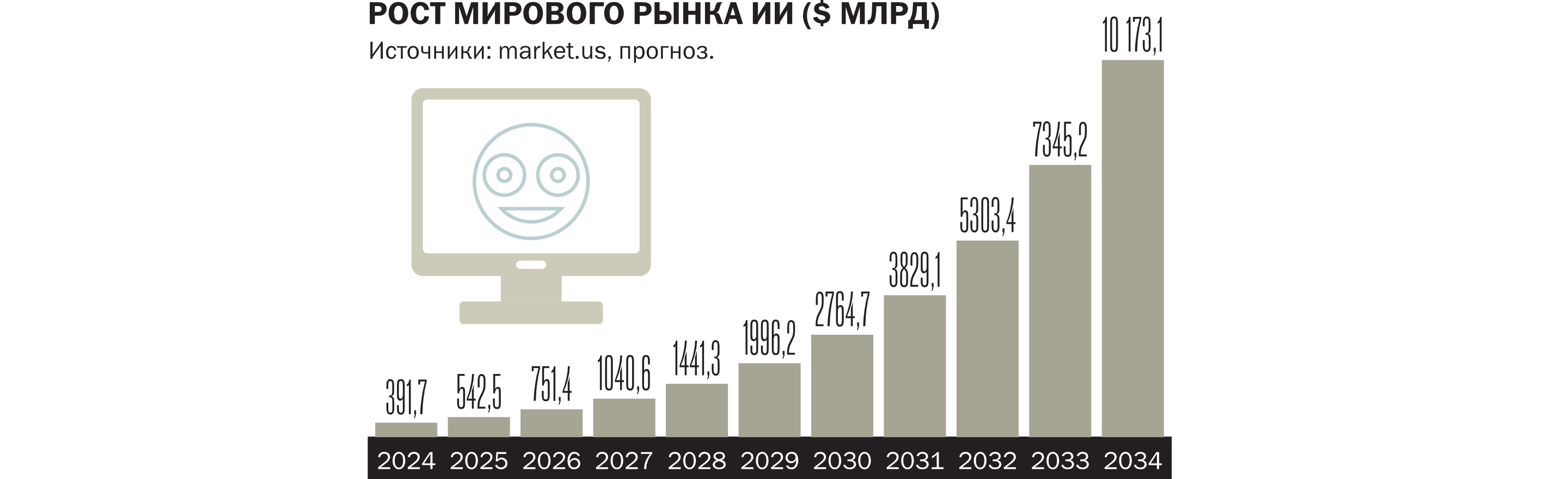 Самое светлое будущее мировому ИИ-рынку сулят аналитики компании Market.us. Рынок в 2024 году они оценивают в $391,7 млрд, в 2025 году, по их прогнозу, он вырастет до $542,5 млрд, а темпы роста в размере 38,5% в год позволят в 2034 году достичь уровня $10,173 трлн.