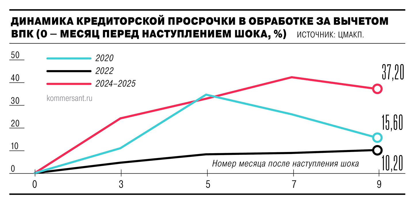 Рост ставок спровоцировал и рост кредиторской задолженности перед подрядчиками и поставщиками. Такая статистика, отметим, задокументирована впервые: из-за превышения депозитными ставками инфляции и, как следствие, «штрафных» санкций за просрочку компании стали наращивать кредиторку, накапливая средства на срочных депозитах. Ярче всего подобная динамика прослеживается в сфере обрабатывающей промышленности (без учета нефтепереработки и ВПК): на седьмой месяц после повышения ключевой ставки неплатежи подскочили на 42,4%, немного опустившись спустя два месяца до 37,2% (см. график). Для сравнения, примерно такого же уровня (34,7%) показатель достигал лишь на пятый месяц после введения санкций. При этом, в отличие от 2020 и 2022 годов, сейчас «нет внятных признаков нормализации», отмечают в ЦМАКП.