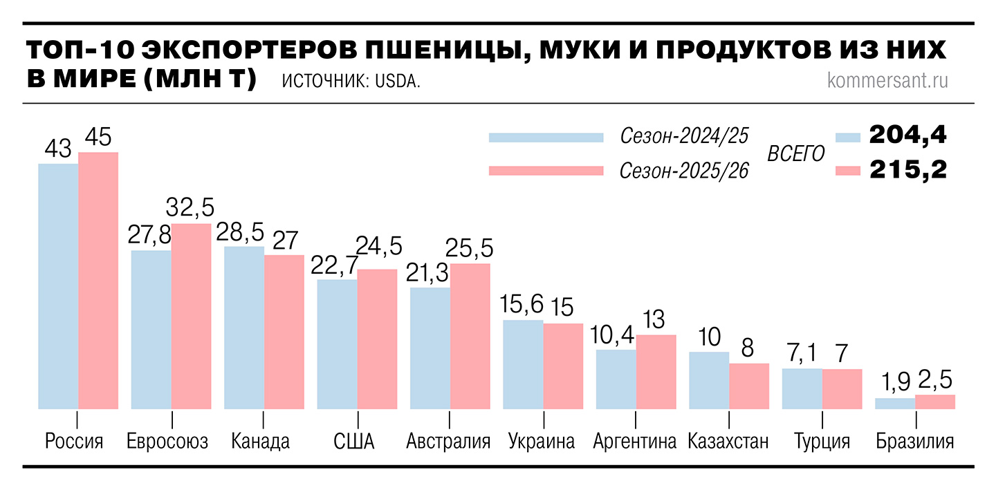 В первые три месяца сельскохозяйственного года (июль—сентябрь) экспорт российской пшеницы составил 10,9 млн тонн, сократившись почти на 29% год к году. Плохое начало сезона — результат ограниченного спроса со стороны импортеров. Покупатели российской пшеницы рассчитывают на снижение цен с текущих $226 хотя бы до $220 за тонну. Их ожидания подкрепляются ростом экспортного потенциала стран Южного полушария.