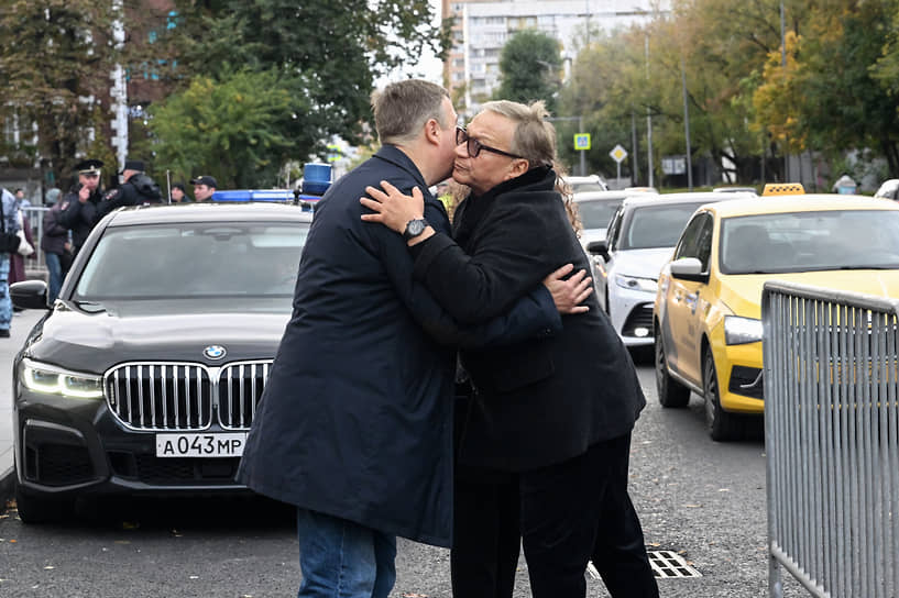 «Вон, смотрите, этот идет, ну, программу он ведет на втором — Соловьев»,— несколько неподобающе радостно для обстановки воскликнула женщина, снимающая видео, когда мимо проходил актер Иван Охлобыстин. «Ну какой же это Соловьев — это не он. Ваня это Охлобыстин ж, священником он был, помнишь?» — одернула ее соседка. «А, ну да, Ваня, наверное, ну похожи ж». «Ведущий программы на втором» Владимир Соловьев, впрочем, появился всего через пару минут с матерью Инной. В течение часа в храм периодически еще шли люди, среди них тоже было достаточно известных личностей. Например, за медицинской маской прятался сразу узнанный всеми народный артист РФ Александр Розенбаум. Другая группа дам, стоявших среди венков, узнали в лицо, но не вспомнили по имени (но на всякий случай сфотографировали) прошедших мимо них режиссера Сергея Газарова и депутата Госдумы и певца Дениса Майданова.