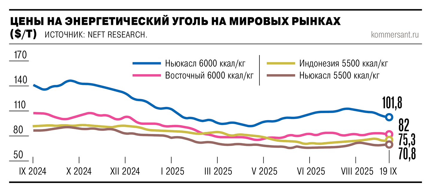 По данным NEFT Research, австралийский энергетический уголь калорийностью 6000 ккал на кг на восточных рынках на 19 сентября стоил $101,8 за тонну, российский аналогичного качества — $82 за тонну. Уголь из Индонезии калорийностью 5500 ккал на кг оценивался в $75,3 за тонну.