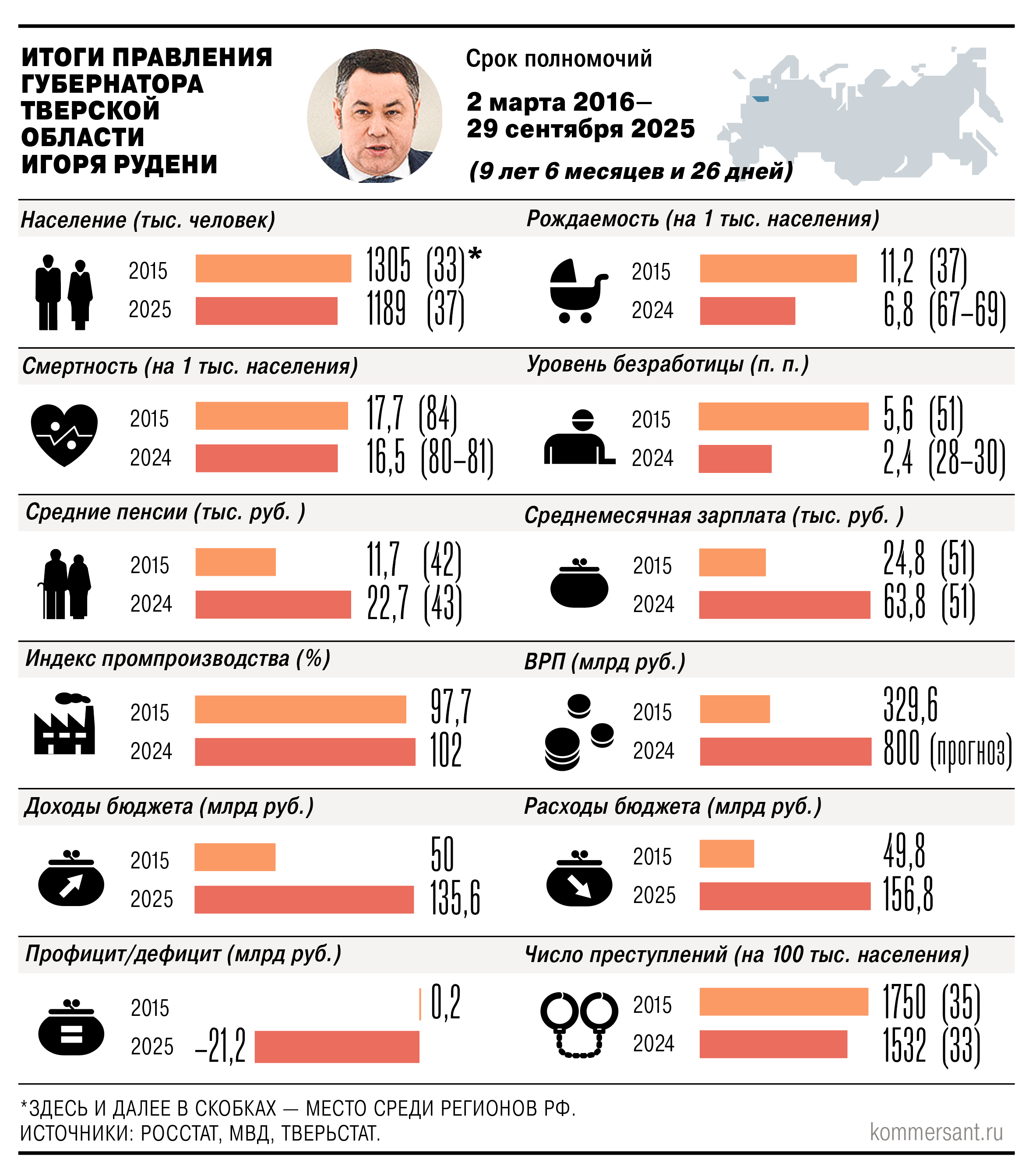 Политолог Константин Калачев полагает, что с точки зрения социально-экономического развития Тверской области итоги работы господина Рудени (см. график) можно считать неплохими, хотя «прорыва» не случилось.