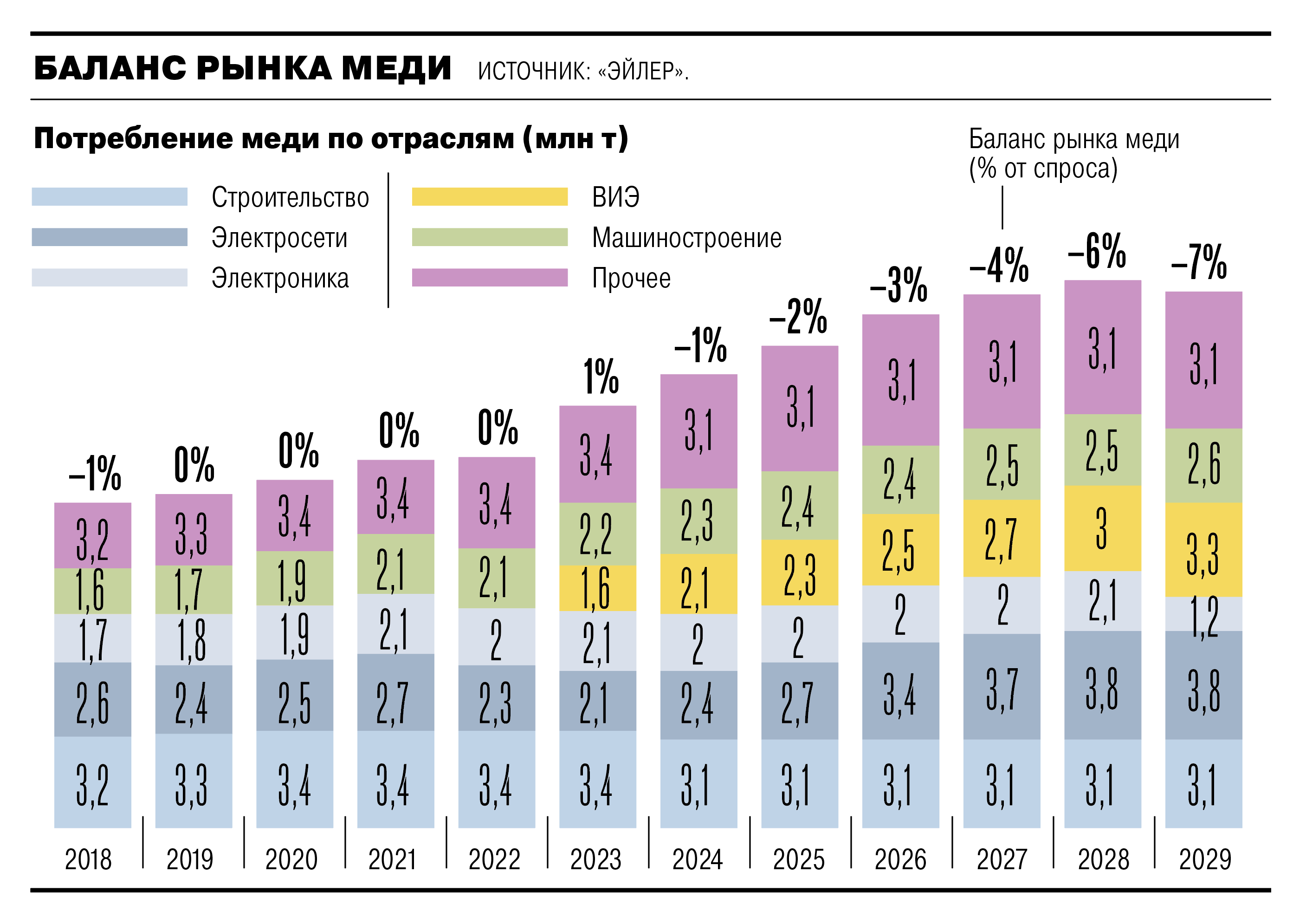 Энергетический переход является ключевым драйвером увеличения глобального спроса на медь, так как производство электромобилей, например, требует до 80 кг меди на одну единицу, в то время как производство традиционных авто — в четыре раза меньше, лишь 20 кг. Ветрогенераторы и солнечные установки используют меди в 4–6 раз больше на мегаватт по сравнению с углем или газом. Таким образом, уже к 2030–2040 годам доля спроса от чистой энергетики может доходить до 38–45% всего потребления меди в мире, указывает аналитик Freedom Finance Global Владимир Чернов.