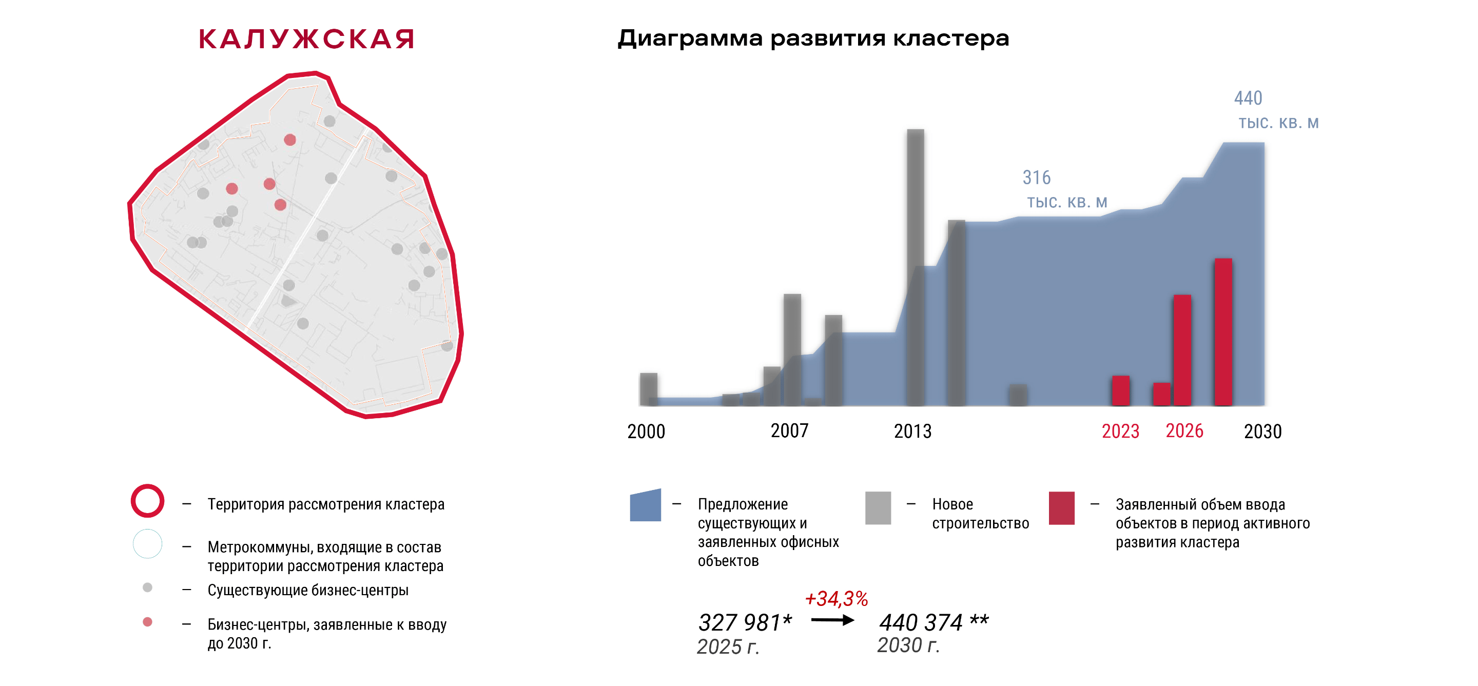 Особое внимание в исследовании уделяется кластеру «Калужская», который представляет собой яркий пример новой волны девелопмента, получившей развитие на фундаменте существующего делового района. В отличие от других существующих кластеров, экспансия Калужской метрокоммуны — внутренняя. Основная причина формирования исходного органического делового кластера — это редевелопмент. Катализатором новой волны офисного строительства стал очередной этап «браунфилд»-девелопмента, начавшийся с вводом в эксплуатацию Большой кольцевой линии метро и наложившийся на активное развитие программы стимулирования мест приложения труда (МПТ). Это привело к появлению новых знаковых объектов, таких как БЦ GEOLOG 2 (2026), Level Work Воронцовская (2026) и Stone Калужская (2028). Общее предложение офисных площадей в кластере «Калужская» к 2030 году увеличится на 34,3%, достигнув 440 тыс. кв. м.