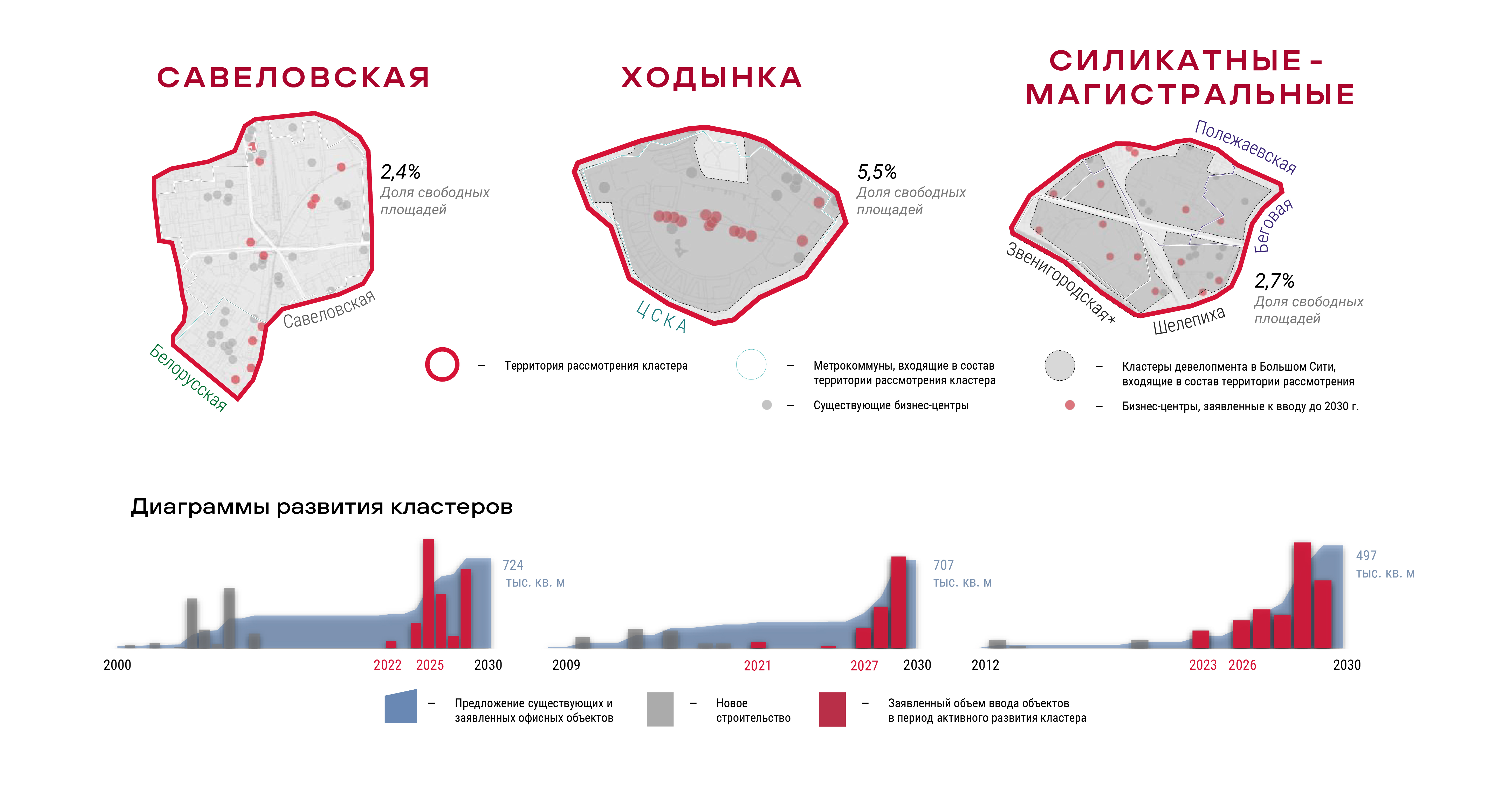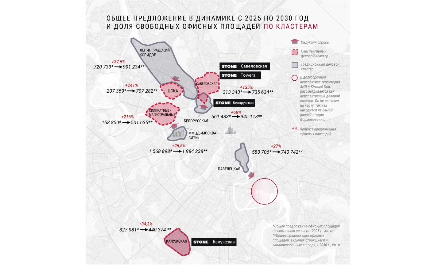 Commonwealth Partnership (CMWP) и девелопер STONE провели совместное исследование «Деловые кластеры Москвы: традиционные и перспективные». Согласно исследованию, развитие офисной недвижимости в Москве характеризуется смещением активной строительной фазы в перспективные кластеры, такие как «Савеловская», «Ходынка», «Силикатные—Магистральные» и «Калужская»*, в то время как традиционные деловые районы, такие как «Павелецкая», ММДЦ «Москва-Сити», «Белорусская» и «Ленинградский коридор», прошедшие начальную реализацию, находятся на стадии обновления и расширения существующей инфраструктуры. Цикл жизни делового кластера составляет 4–5 поколений офисов, а девелоперский цикл одного объекта в идеальном сценарии оценивается в 4–4,5 года. Таким образом, становление деловой локации оценивается в 15–20 лет от момента начала строительства первых объектов.