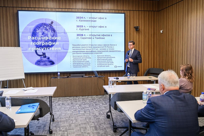 В своем выступлении старший вице-президент банка Максим Розов рассказал о перспективах НОВИКОМа по расширению географии сети. Банк рассматривает возможность открытия новых офисов в городах присутствия предприятий «Ростеха» с численностью сотрудников от 2,5 тыс. человек и в местах концентрации производств приоритетных для банка гражданских отраслей.