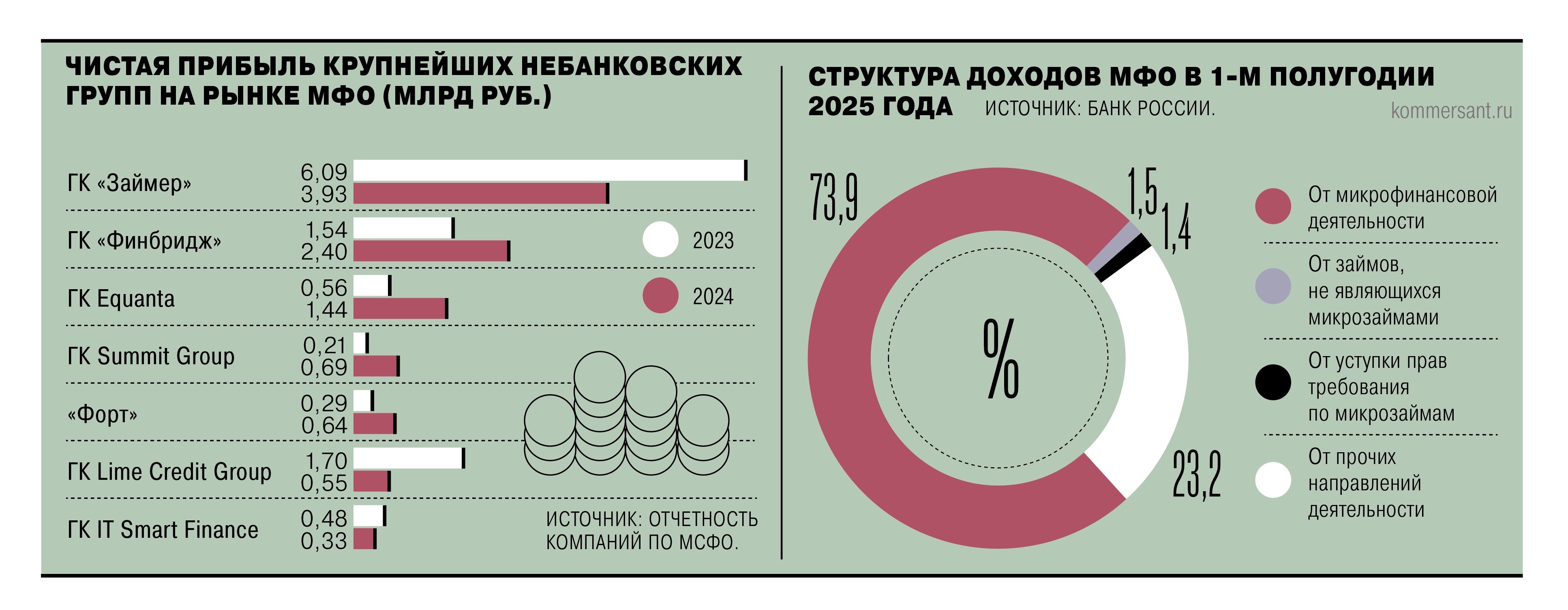 Оправданность такого подхода подтверждают цифры. Так, по данным ЦБ, прибыль МФО по итогам перового полугодия 2025 года составила 25 млрд руб. (минус 5% год к году). При этом около трети МФО работают в убыток, в основном это небольшие компании. «Процесс консолидации в отрасли МФО сохраняется — доля топ-20 крупнейших компаний по портфелю займов обновила многолетний максимум и достигла 65%»,— следует из отраслевого обзора ЦБ. Дополнительные направления деятельности поддерживают доходы крупных МФО с развитой технологической инфраструктурой. По оценке регулятора, в первом полугодии 2025 года непрофильные направления обеспечили 23% доходов отрасли.