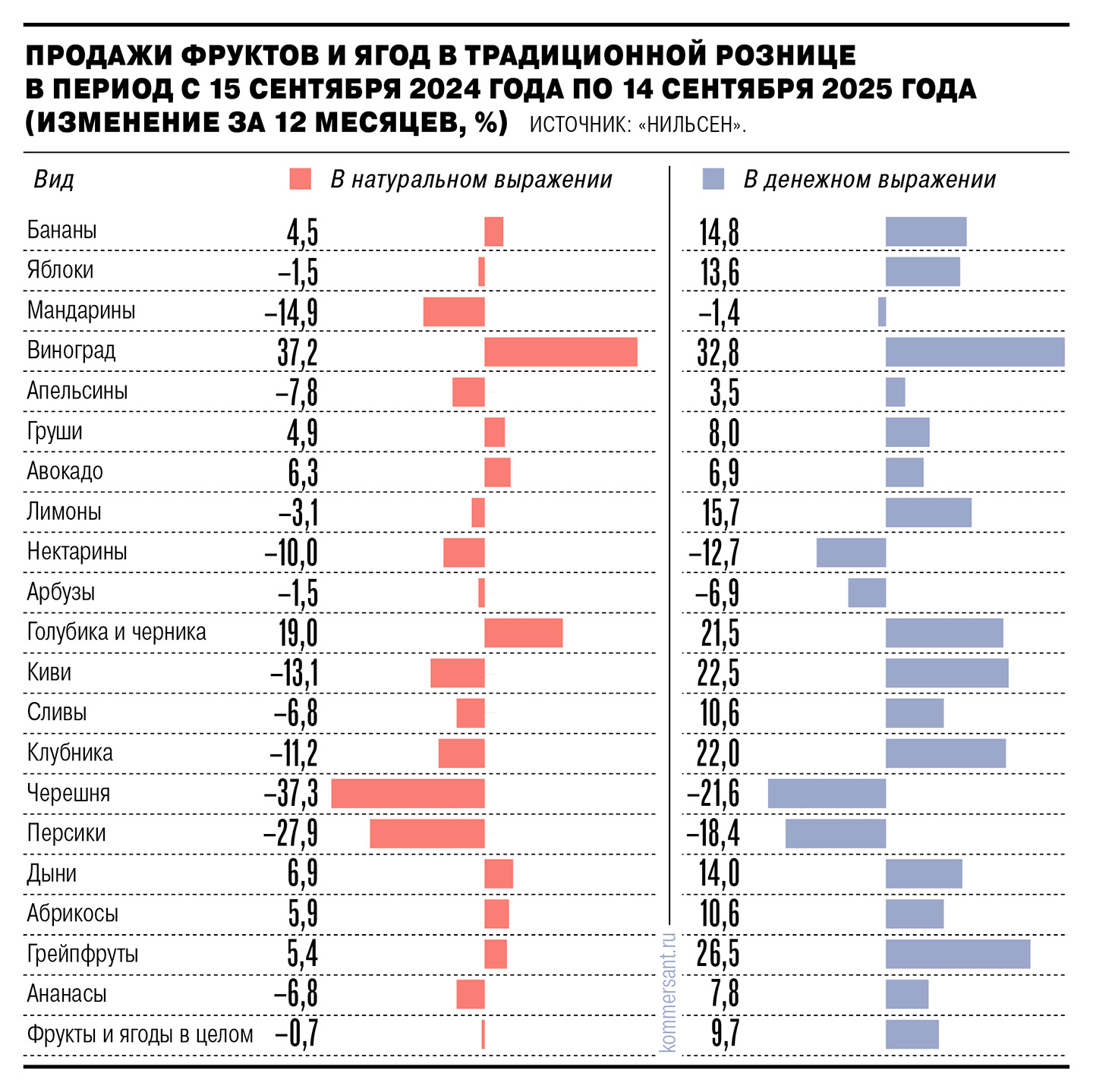 Согласно «Нильсен», розничные продажи голубики и черники в натуральном выражении в период с 15 сентября 2024-го по 14 сентября 2025 года выросли на 19% год к году, винограда — на 37,2%. Категория фруктов в целом за тот же период продемонстрировала снижение на 0,7%.