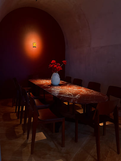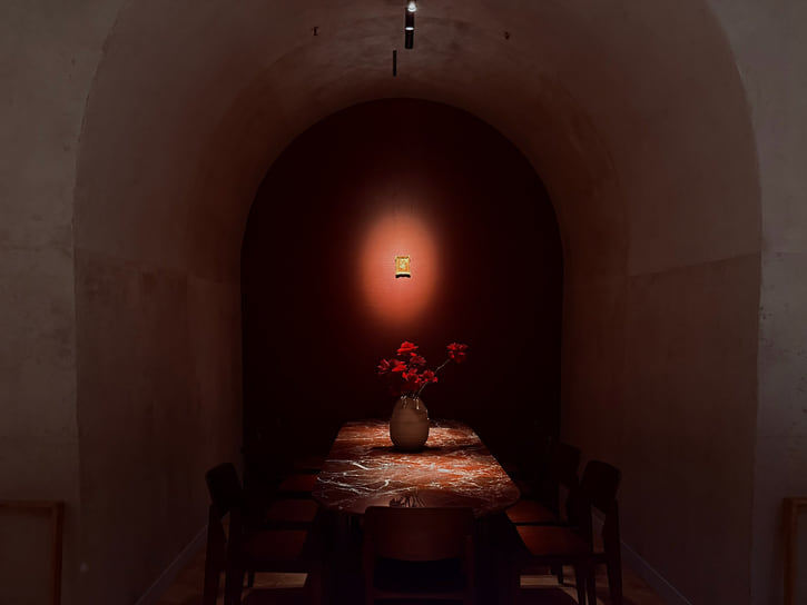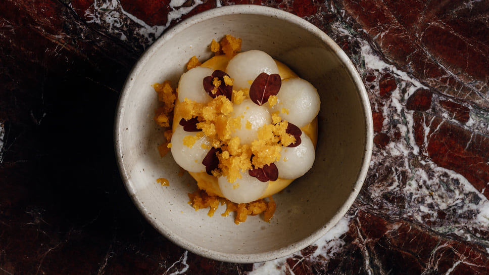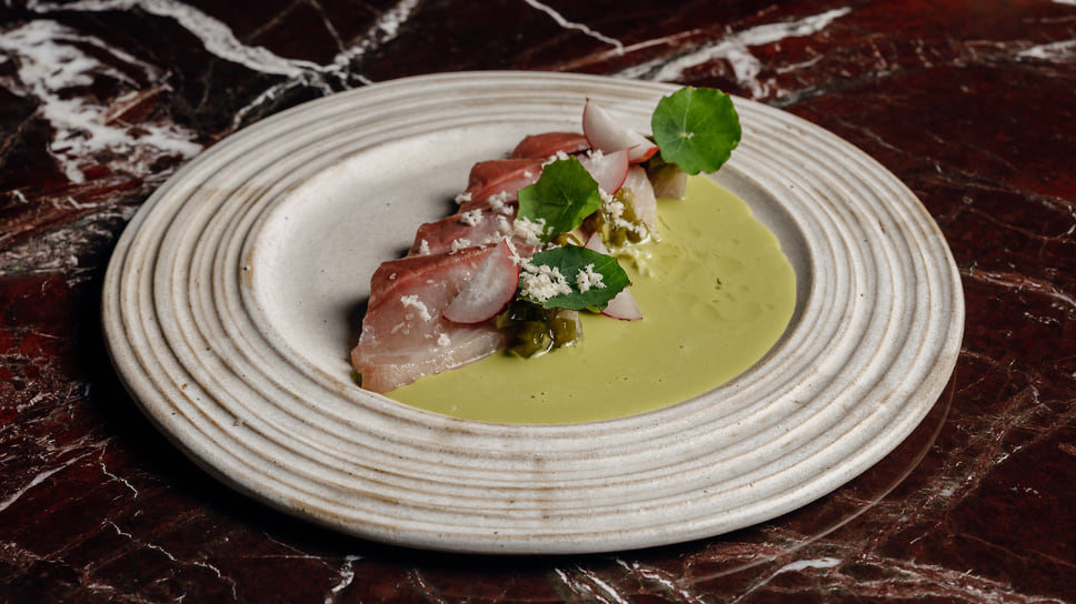 0.75 Please Moscow работает вечерами, а это значит, что здесь можно наблюдать за закатными метаморфозами города: игрой света и теней и стремительно меняющейся картинкой за окнами. На новом месте не стали ограничиваться какой-то одной кухней и расширили географию. Единственная константа — это свежие локальные фермерские продукты. У ресторана появился новый партнер — фермерское хозяйство «Колхоз №1», которое выращивает овощи и травы. На закуску подадут гребешок со слайсами фермерского цуккини «разной молодости»: от крупных колец цуккини до самых маленьких, заправленных свежим лимонным соком. Классика меню, перекочевавшая со старого места,— чипсы из льна с намазкой из крема из огуречной травы с икрой хариуса. Карпаччо из хамачи подается с соусом из шалфея, маринованным васаби и имбирем. Оторо — самую жирную и деликатесную часть тунца — подают в виде сашими с арбузной редькой и сельдереем. Для пирога с томленым ягненком и жареной капустой придумали артистичную подачу: на изразце майолики для печи, который, как и некоторые детали в ресторане, нашли на винтажном рынке.