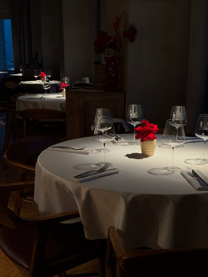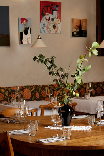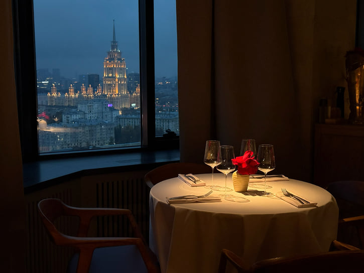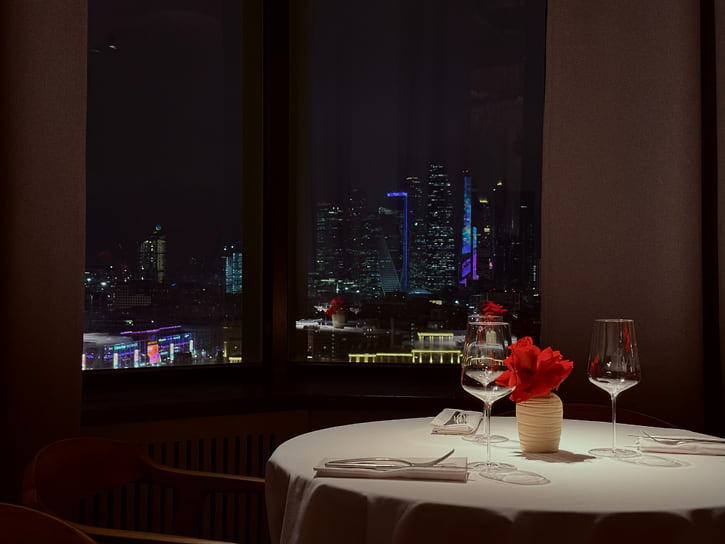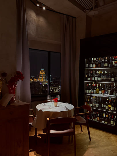 В бесконечной череде ресторанных закрытий на Патриках есть свои плюсы. Например, филиал известного на всю Сибирь ресторана 0.75 Please переехал на новое место, которое оказалось ему как нельзя подходящим. Ранее ресторан занимал достаточно тесное помещение в Ермолаевском переулке, а теперь разместился на 20-м этаже на Смоленке и может похвастаться феноменальным панорамным видом на Москву. Вместе с переездом обновились и меню, и интерьер. Пространство удачно зонировано: тут есть и романтичные столики у видовых окон, накрытые белыми скатертями, и пара высоких барных столов, и две приватные комнаты с абсолютно разным настроением. Интерьер ресторана придумал сам красноярский ресторатор Александр Митраков, а шеф-повар Александр Кучеров, имеющий художественное образование, написал для него две большие картины.