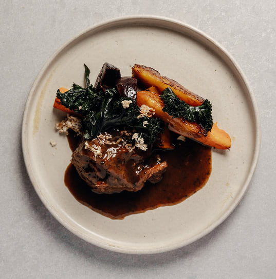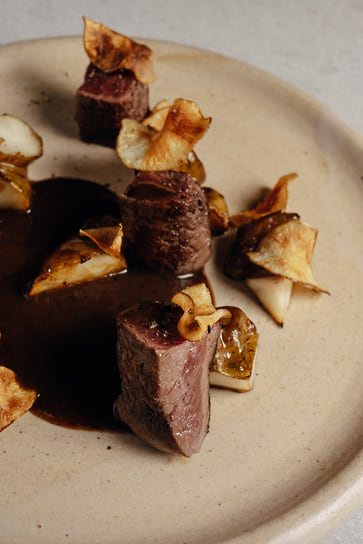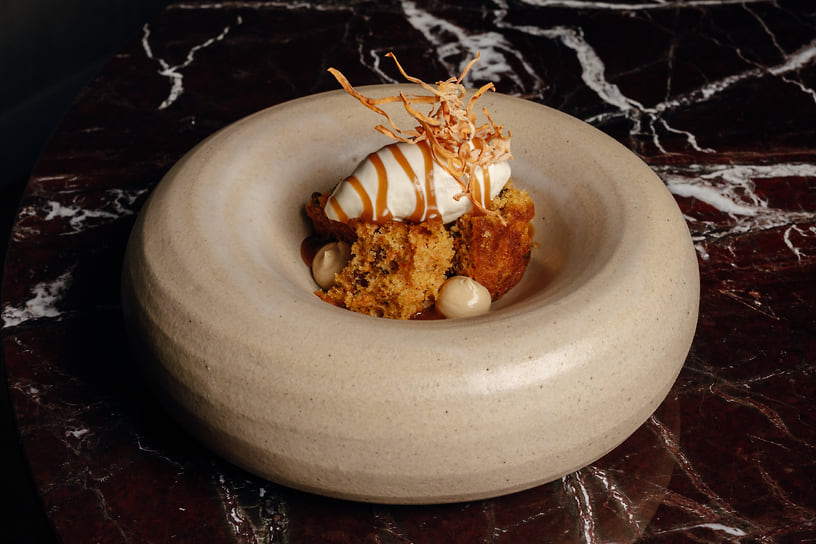 На горячее — картофельная лазанья, где пласты теста заменили на тонкие слайсы картофеля, подается на подушке из перца рамиро; нежное филе палтуса с соусом берблан и картофельным пюре; утка конфи — очень нежная, буквально распадающаяся на волокна — подается с рагу из овощей и соусом демигляс. На десерт от шеф-кондитера Полины Зубахи — кейк из корнеплодов с мороженым из топинамбура с ликером «Бейлис» и цикорием.