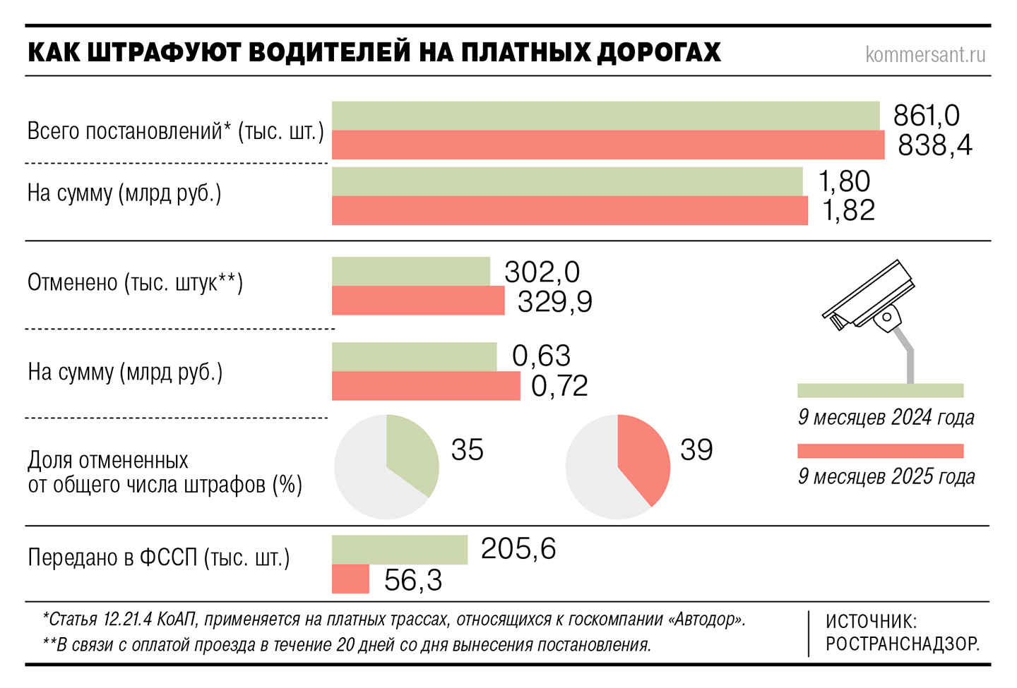 Согласно данным Ространснадзора (предоставлены по запросу “Ъ”), за девять месяцев 2025 года за неоплаченный проезд на федеральных платных дорогах вынесено 838,3 тыс. штрафов на общую сумму 1,81 млрд руб. Число постановлений по сравнению с аналогичным периодом прошлого года сократилось незначительно — на 2,7%. Одновременно с этим достаточно заметно — почти на 9% — увеличилось число штрафов, отмененных в связи с уплатой долга в 20-дневный срок (см. инфографику). Также почти в четыре раза сократилось количество постановлений, которые Ространснадзор направляет на принудительное исполнение в Федеральную службу судебных приставов.
