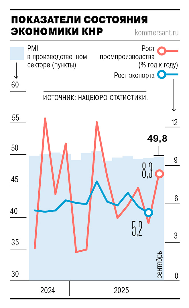 Положительное сальдо внешнеторгового баланса КНР в сентябре составило $90,45 млрд — это на $8,76 млрд больше, чем в сентябре 2024-го. При этом импорт рос самыми значительными темпами за полтора года — его расширение оценивается в 7,4% (до $238,1 млрд), и эти данные внушают аналитикам некоторый оптимизм: они могут указывать на укрепление внутреннего спроса, а от его перспектив во многом зависит деловая активность в производственном секторе страны (см. “Ъ” от 1 октября).