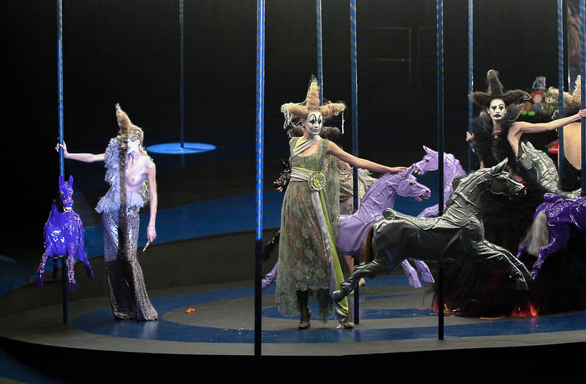 А бывают и совсем другие интерпретации. Самая знаменитая — Alexander McQueen, коллекция What a Merry-Go-Round 2001 года. Маккуин использовал карусель не как милую ностальгию, а как мрачный театр: страшная, нуарная конструкция, где аттракцион превращался в драму про утрату детства и темную сторону игры.