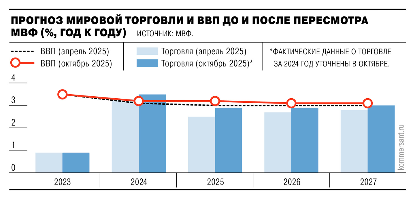 В октябрьском World Economic Outlook МВФ рост мирового ВВП в 2025 году оценен в 3,2%, а торговли товарами и услугами — в 2,9%, это выше, чем в апрельской версии прогноза, на 0,2 и 0,4 процентного пункта (п. п.) соответственно. Экономисты фонда связывают этот пересмотр с восстановлением импорта развивающихся стран и закупками и поставками компаниями впрок в ожидании новых ограничений. Это ускоряло экспорт и импорт до их введения, напоследок кратковременно разогнав торговую динамику.