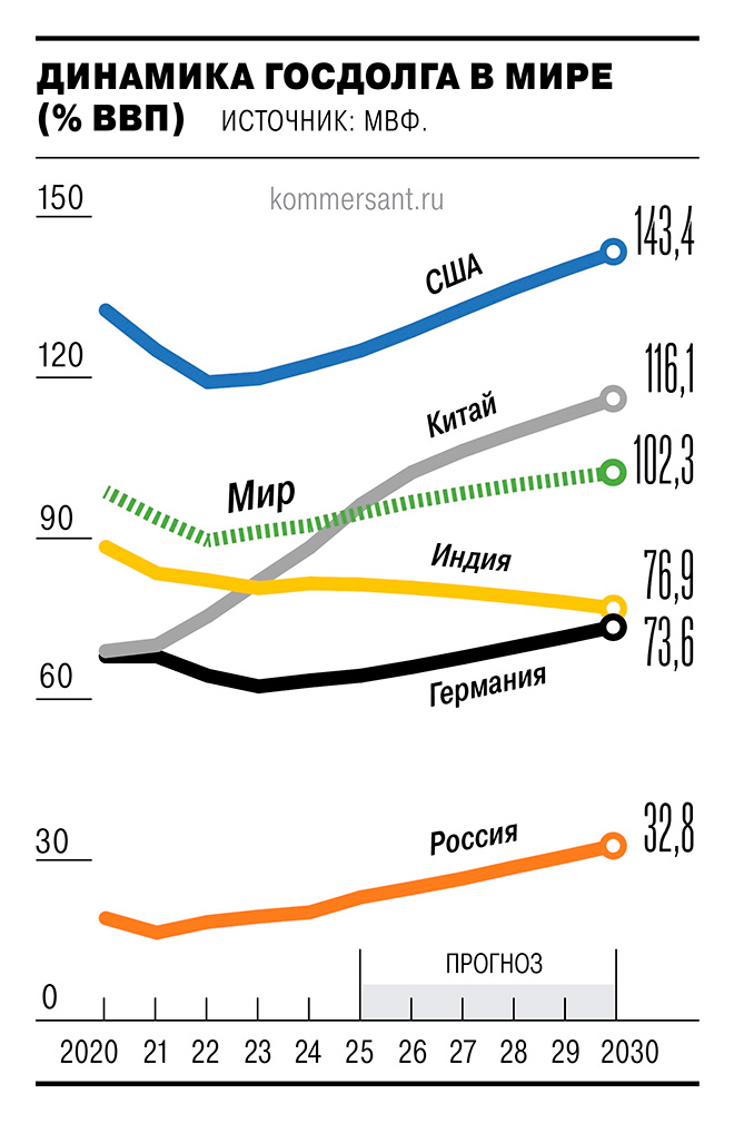 В 2025 году уровень глобального госдолга достигнет 94,7% ВВП (92,4% в 2024-м), считают в МВФ. Спрос на заимствования на фоне геополитической напряженности (военной операции РФ на Украине, торговых войн США и партнеров) продолжает расти, в том числе за счет трат на оборону и энергетическую безопасность. Судя по поступающим данным, государства также наращивают вложения в здравоохранение и борьбу с изменением климата. Во многих крупных экономиках, в том числе в Канаде, Франции, Японии и Великобритании, госдолг уже превышает 100% ВВП. Если в 2024 году предполагалось, что примерно две трети стран смогут стабилизировать или снизить уровень долга в ближайшие годы, то теперь о таких надеждах фонд не пишет и лишь призывает страны относится к проблеме серьезнее.