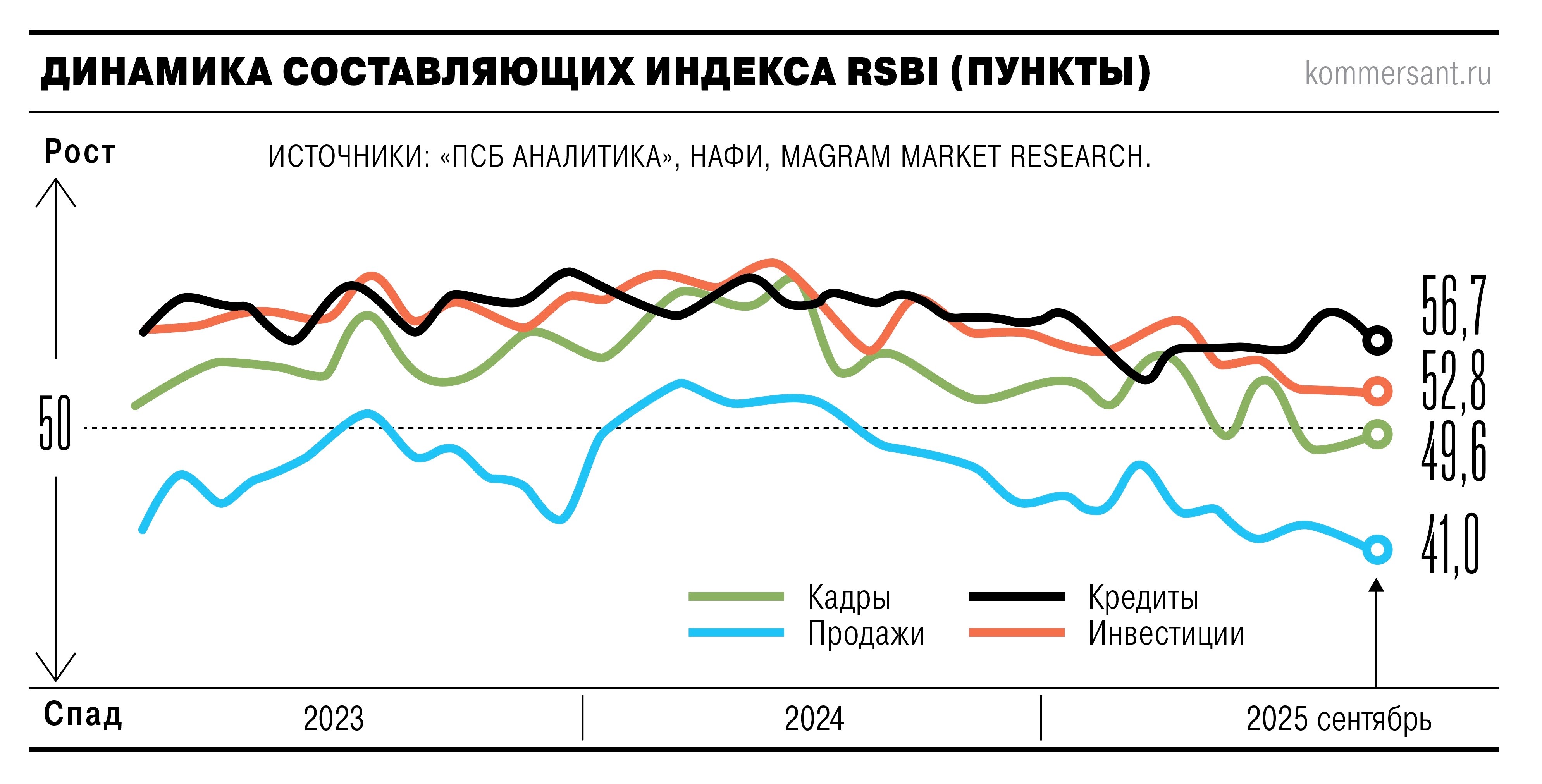 Деловая активность МСП перешла к снижению: измеряющий ее индекс RSBI (его рассчитывают ПСБ, «Опора России» и Аналитический центр НАФИ) в сентябре 2025 года составил 49,6 пункта, впервые с декабря 2022 года зафиксировав спад (границей считается отметка в 50 пунктов, весь последний год показатель постепенно приближался к ней, но все же держался в зоне роста). В августе, напомним, значения индекса были равны 50,4 пункта, в июле — «пограничным» 50 (см. “Ъ” от 19 сентября).