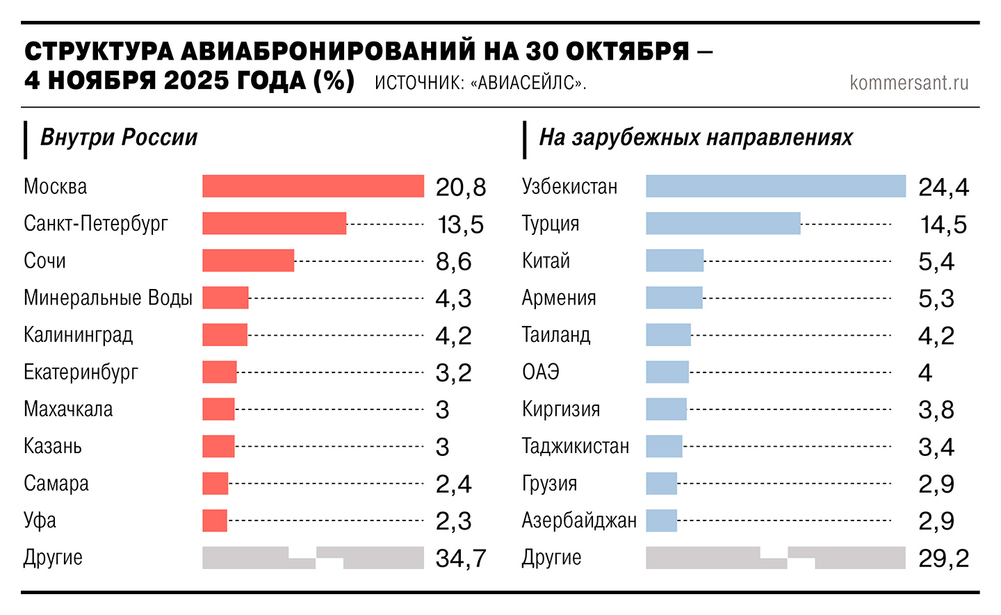 По данным Travelline, основной объем бронирований внутри страны с 30 октября по 4 ноября формирует Москва, на долю которой приходится 15,6% от совокупного объема продаж. На втором месте — Краснодарский край, доля которого за год снизилась с 16,5% до 14,7% в совокупном объеме бронирований. Схожая динамика прослеживается и по данным авиабронирований. По данным «Авиасейлс», доля Сочи в структуре продаж авиабилетов по России за год снизилась с 9,2% до 8,6%. У OneTwoTrip сокращение более выраженное — с 10,6% до 6,6%.